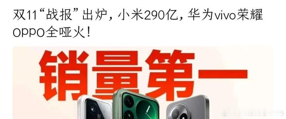 这标题取得好:双11“战报”出炉,小米290亿,华为vivo荣耀OPPO全哑火……