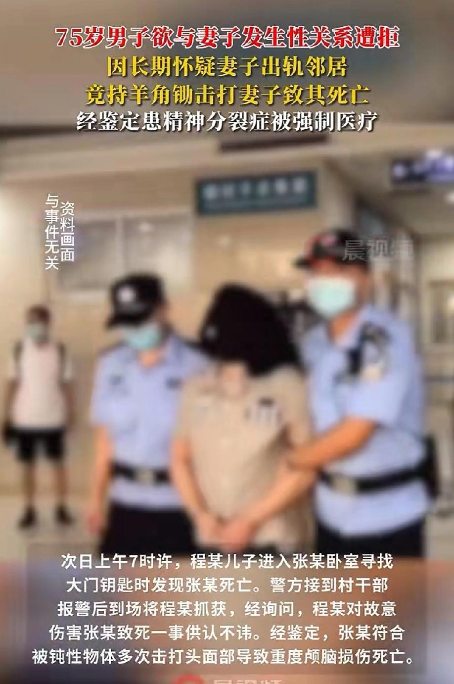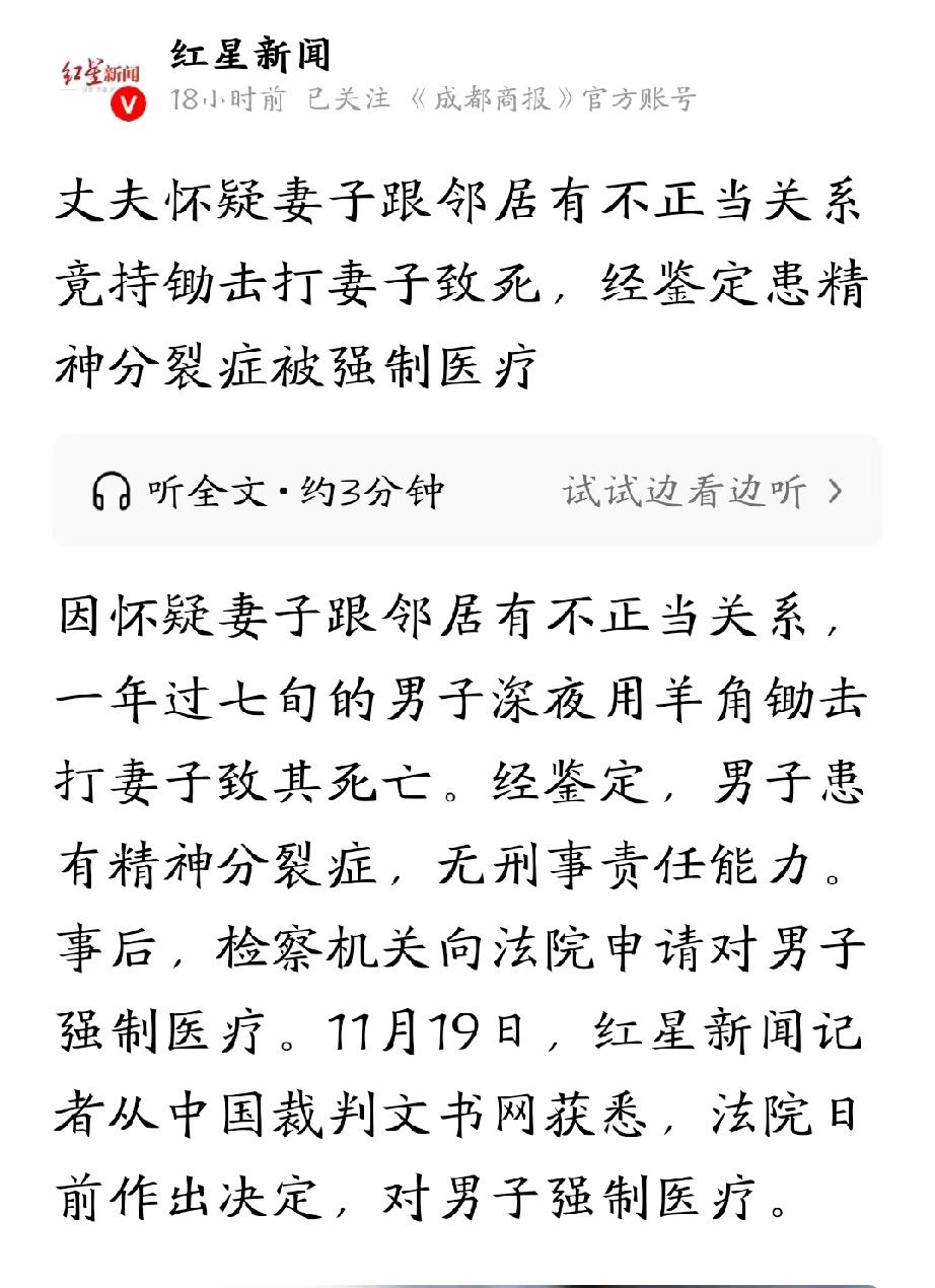 陕西安康,七旬男子想和妻子发生关系,遭到拒绝后,他怀疑妻子跟邻居保持不正当关系,于是趁着妻子熟睡,用羊角锄多次击打妻子导致身亡。本以为杀人偿命,男子难逃法网,不料,司法鉴定显示男子为精神分裂症,无需承担刑事责任。检察机关:男子危害性极大,申请对其强制医疗。法院审理后,作出了公平公正的判决。 75岁的程某和妻子张某相伴走过大半辈子,本以为可以在村里平稳的度过一生,安享晚年,却因程某的无端猜忌,酿成了一桩血案。 2025年2月2日,程某一早就去了隔壁兄弟家串门,午饭晚饭都在那儿吃的,还喝了不少酒。 酒劲上涌,他心里那点积压已久的疑窦又冒了出来。 这些年,他总怀疑妻子张某和邻居谭某有不正当关系,越想越钻牛角尖,酒喝得越多,心里的火气就越旺。 晚上9点多,程某醉醺醺地回到自己卧室躺下,脑子里翻来覆去全是那些捕风捉影的念头,怎么也睡不着。 约莫11点,妻子张某轻手轻脚地经过他的卧室,准备回自己房间休息。 程某突然起身拉住她,想要发生性关系,可张某一来觉得丈夫喝多了,二来也没这个心思,当场就拒绝了他。 被拒绝的瞬间,程某心里的猜忌瞬间变成了怨恨,他认定妻子是因为心里有别人才对自己冷淡。 越想越偏激的程某,报复的念头像野草一样疯长。 他悄悄爬起来,摸索着走到后院,抄起墙角那把平时用来锄地的羊角锄,展开了他的报复。 拿着羊角锄,程某一步步挪到张某的卧室门口,房门没锁,他轻轻推开一条缝,看到张某已经熟睡在床上。 程某早已被怨气埋没了理智,眼里没有了往日的夫妻情分,只剩下满心的怨恨。 他举起羊角锄,朝着张某的脸部狠狠砸了下去,一下又一下,直到张某没了动静,他才停下手。 冷静下来几分后,程某心里掠过一丝慌乱,但更多的是一种扭曲的解脱感。 事后,他还把羊角锄放回后院原处,像没事人一样回到卧室,准备美美的睡一觉。 过了一会儿,程某又忍不住起身,走到张某卧室门口张望,看到妻子一动不动,他心里清楚,人可能已经没了,但还是默默退了回去。 第二天早上7点多,程某的儿子起床后,想找母亲张某拿大门钥匙,推开母亲卧室的门,眼前的景象让他瞬间瘫软在地。 母亲躺在床上,头面部满是血迹,早已没了呼吸。 儿子吓得魂飞魄散,反应过来后立刻哭喊着跑出家门,告诉了村干部,村干部这才赶紧报了警。 警方很快赶到现场,经过勘查和询问,很快锁定了嫌疑人程某。 面对民警的讯问,程某对于用羊角锄打死妻子的事实供认不讳,看不出有丝毫的内疚和歉意。 法医鉴定结果显示,张某是被钝性物体多次击打头面部,导致重度颅脑损伤死亡,凶器正是那把羊角锄。 本以为杀人偿命,程某用这么残忍的手段杀害妻子,至少是个死刑。 让人没想到的是,司法鉴定表明,程某患有精神分裂症,案发时处于发病状态,无刑事责任能力。 如果就这样放任程某,后果可想而知,村民们以后也将寝食难安,大家的生命安全随时都会受到威胁。 当地检察院考虑到程某的病情和潜在的社会危险性,向法院申请了对他的强制医疗。 程某的法定代理人也表示,为了防止他再做出伤害他人的行为,他们也同意对程某进行强制医疗。 原本该相互扶持的老两口,却因为一场无端的猜忌和精神疾病的困扰,落得如此结局,让人不禁扼腕叹息。 其实,精神疾病从来不是暴力伤人的借口,及时的治疗和干预,才能避免这样的悲剧再次发生。 《刑法》第十八条规定:精神病人在不能辨认或者不能控制自己行为的时候造成危害结果,经法定程序鉴定确认的,不负刑事责任,但是应当责令他的家属或者监护人严加看管和医疗;在必要的时候,由政府强制医疗。 程某的行为表面看是故意杀人,但刑事责任的承担以“刑事责任能力”为前提,核心是行为人案发时能否辨认自身行为性质、能否控制自身行为。 根据司法鉴定,程某患有精神分裂症,且案发时处于发病状态,属于法定的免责情形。 但是,无刑事责任能力的精神病人在必要的时候,由政府强制医疗。 结合《刑事诉讼法》相关规定,强制医疗的适用需满足实施暴力行为,危害公共安全或者严重危害公民人身安全,经法定程序鉴定依法不负刑事责任,有继续危害社会可能的条件。 程某虽不负刑事责任,但他的行为已造成他人死亡的严重后果,且精神分裂症未得到有效治疗,存在继续危害社会的极大风险。 检察机关正是基于这一考量,申请对其强制医疗,而程某的法定代理人也同意该措施,符合“必要的时候”的法定情形。 最终,法院经过审理,依法对程某采取强制医疗措施。