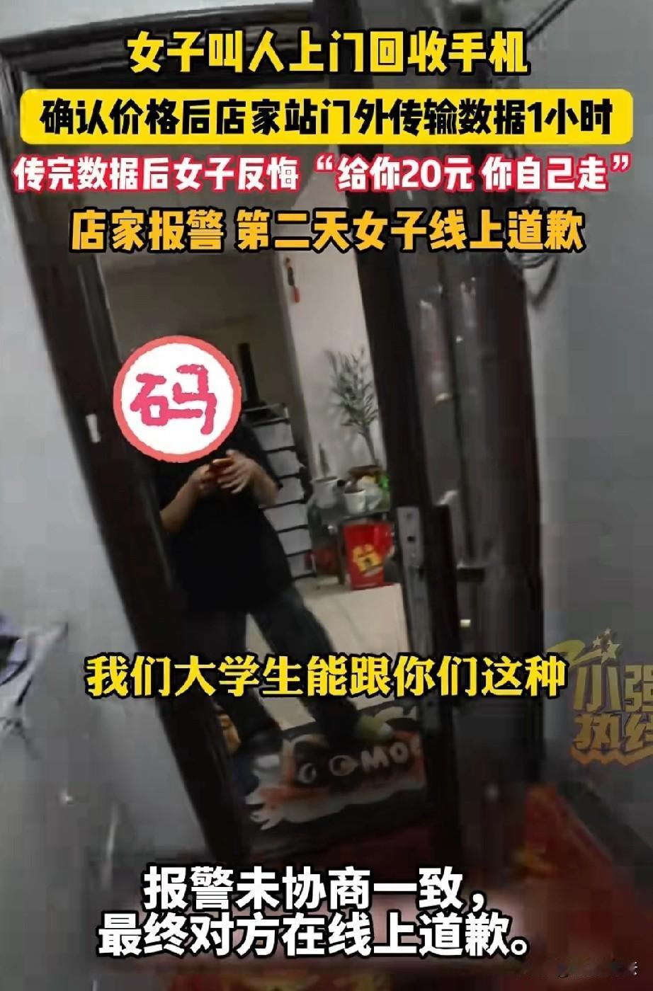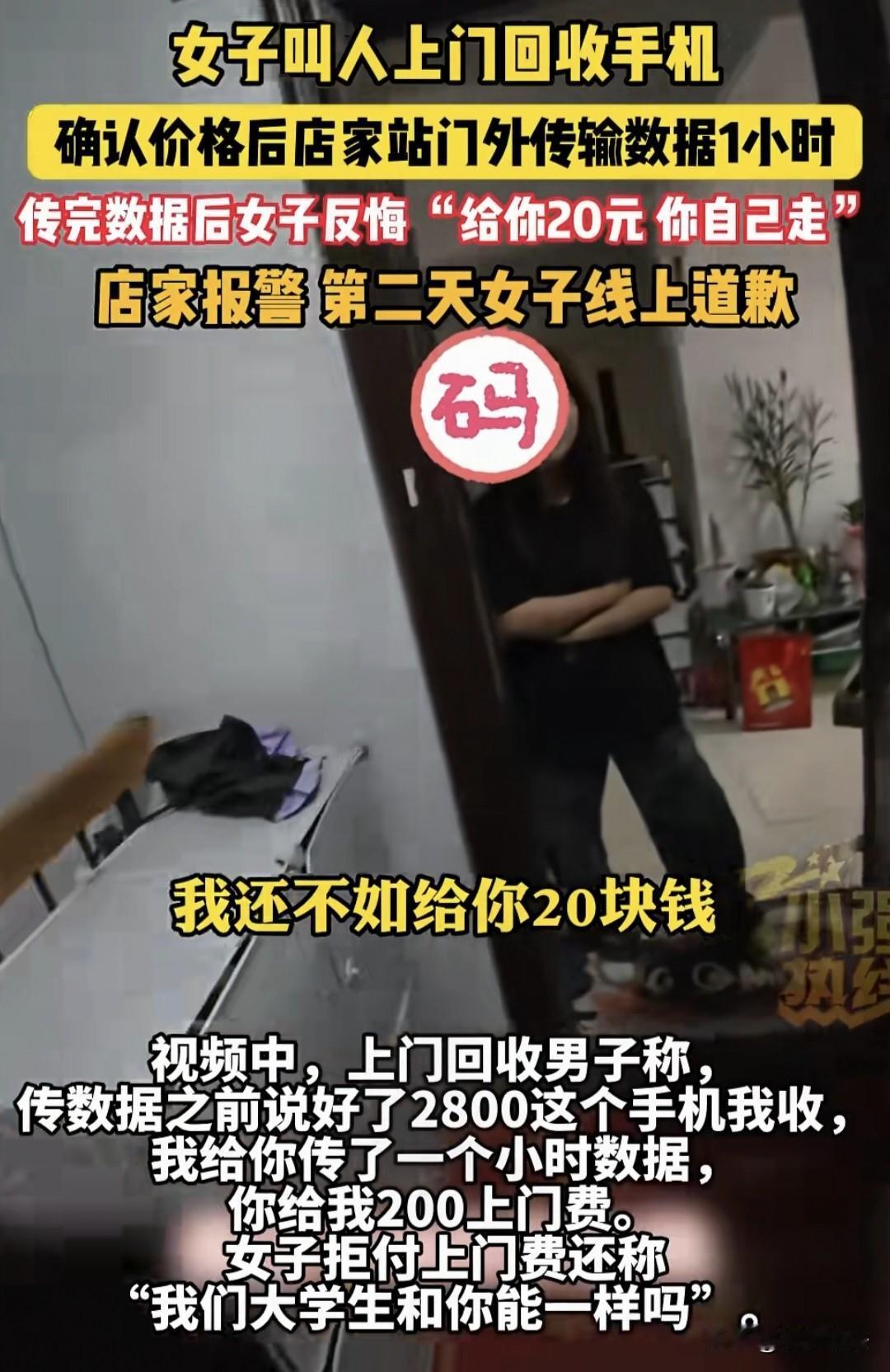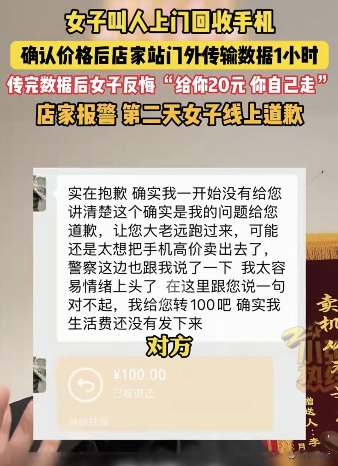 新疆一女子叫人上门回收手机,二人说好价格2800元,店家在门外传输数据1小时,传完后,女子突然说:不想卖了,手机还我。店家气够呛,让女子支付200元上门费,女子却说:给你20块钱,你自己走。店家被激怒:你拿我当狗溜着呢!谁给你惯出来的毛病?女子来一句:我们大学生能跟你们这种二道贩子一样?店家气到报警,接下来的事情让女子啪啪打脸。 近日,一女子买了新手机,就叫了一个店家上门回收旧手机,一个男子前来回收,二人定好了价格为2800元之后,就让男子留在门外传输数据。 男子站在门外传了一个小时的资料,外面挺冷的不说,站的腿都酸了,传完后,准备回收手机。 女子突然反悔了,让男子给3800,男子不同意,毕竟一开始说好了价格,女子干脆说不卖手机了。 男子瞬间懵了,明明都说好了,手机刚才我在导资料前,我跟你确定好了,这个机子2800块钱我收了。我才帮忙给你导的资料。你为啥不卖了? 女子环抱双臂,理直气壮的说:“我就是不想卖,你把手机还给我。” 女子突然反悔,确实让人不爽,你说大老远的把人都叫来了,数据资料也导完了,你说不卖手机了,这不是耍戏人呢么。 男子也没想到会遇到这种情况,虽然生气,还是压着火气说:“我想问你,我来回跑过来,这个费用怎么算?” 女子依然抱个膀,叉着一只腿,默不作声,一副你能奈我何的态度。 男子一看手机是回收不成了,自己也不能白跑啊,就和女子协商说:“要不然,你给我转上200块钱的辛苦费。” 女子立马拒绝:“那不可能,我还不如给你20块钱,你自己走呢。” 男子一听这话火气瞬间上来了,愤怒的质问女子:“你把我当狗溜着呢,谁给你惯出来的这些毛病啊?” 女子倚在门框,玩着手机,轻飘飘的说了一句话,瞬间激怒男子。 女子不屑地说:“我们大学生能跟你们这种二道贩子一样?”那语气高高在上,充满了对男子的鄙视。 男子都被气到无语了,叹口气无奈的说:“大学生!” 接下来,男子也没有惯着她,直接报警,对于这种人必须给她一个教训,这么不尊重别人,所以得给她好好上一课。 报警后,双方未协商一致。 没想到,第二天男子意外的接到了女子在线上发来的的道歉。 原来,女子在第二天通过客服号,找到了男子正式发文道歉。 女子大意说,确实是自己没有说清楚,大老远让男子跑来,但自己还是想把手机卖高价,当时没控制好情绪,帽子叔叔已经说了她,所以,跟男子说对不起,并给男子转了100块钱,因为生活费没发下来,别嫌少。 男子一看女子正式道歉了,心也软了,给女子回复了一些话。 男子说,看到女子能道歉也感到很欣慰,不过想了一下自己可能也有做的不足之处,好像在为难一个女孩一样,也跟女孩表示抱歉。 这些年自己干这行,最接受不了翻手为云覆手为雨的客户,毕竟时间和人力都是有成本的,所以,这事就这样了,钱也不收了,知道她是学生,可以理解她的难处。 最终,男子没有要女子任何补偿。 男子说,自己原本也不是为了要钱,就是为了争口气。 这件事最终以和解告终,女子幡然悔悟,及时道歉,拿出了陈恳的态度,男子也胸襟宽广,不仅没有收女子的钱,还和和气气的把事情说开了,这件事也算圆满结局了。 有人说,女人说话不算数,浪费别人时间 跟精力,要是收手机的是从外地来的,20都不够路费的。 就是不会自己倒资料,白嫖别人劳动力来的,现在有些人白嫖习惯了,啥都想白嫖! 契约精神越来越薄弱,以前的信用在如今都消耗的所剩无几,人跟人之间,再没有信用可谈,看着真是难受。现在跟人面对面打交道的话,都得戴上视频记录仪了,不然遇到这种无赖,可麻烦了。 从法律方面,在此事中,女子与回收男子就旧手机回收价格达成了2800元的约定,这一过程虽未签订书面合同,但口头约定在法律上同样具有效力,可视为双方达成了口头合同。 合同成立后,双方都应按照约定履行各自的义务。 不过,女子在男子完成数据传输后突然反悔,拒绝以2800元的价格出售手机,属于不履行合同义务的行为,构成违约。 《民法典》577条规定:当事人一方不履行合同义务或者履行合同义务不符合约定的,应当承担继续履行、采取补救措施或者赔偿损失等违约责任。 另外,男子要求女子支付200元辛苦费,从法律角度看,女子违约行为导致男子遭受损失,他可以要求女子赔偿。 男子来回奔波以及完成数据传输所花费的时间和精力,都属于因女子违约而产生的损失范畴。 不过,在实际操作中,男子需要提供相关证据来证明自己的损失,比如来回的路程、花费的时间等,以便确定合理的赔偿金额。 最后,人与人之间的沟通,需要真诚相对,互相尊重,更要讲诚信,有话好好说,这样才能和谐共处。 关注@福康说法 从日常点滴学法律,生活安稳更有底