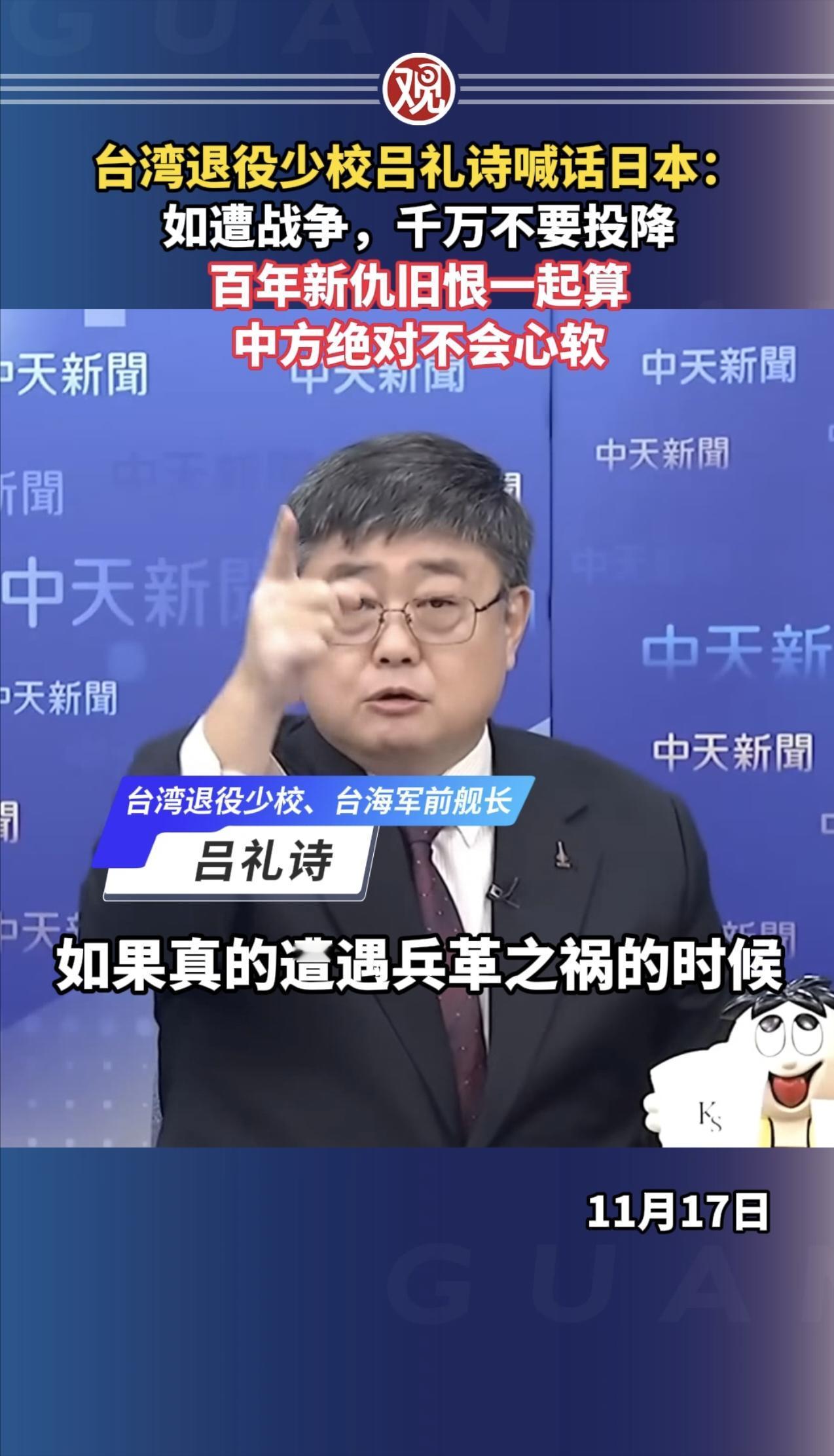 台湾退役少校吕礼诗喊话日本:如遭战争,千万不要投降,百年新仇旧恨一起算,中方绝对不会心软。 麻烦看官老爷们右上角点击一下“关注”,既方便您进行讨论和分享,又能给您带来不一样的参与感,感谢您的支持! 最近台湾退役少校吕礼诗的一段视频在网络上炸了锅,这位在台军服役了十八年的老舰长,面对镜头时说出了一句让无数人拍手称快的话:如果日本真敢因为台海问题动手,千万别想着投降了事,从甲午到抗战的百年账,这次要一笔一笔算清楚。 吕礼诗不是那种只会敲键盘的网络评论员,他祖籍天津,当过导弹巡逻艇的舰长,对台海周边的军事部署了如指掌,这样的人说出这番话,分量自然不同,他看得明白,当下日本那些小动作背后藏着什么心思。 日本新上台的领导人高市早苗,上任没多久就开始作妖,她在国会公开放话,说台湾出事就等于日本的生死存亡受威胁,还暗示要动用所谓集体自卫权派兵介入。 这话听着耳熟吧?当年日本军国主义者发动侵略战争时,用的就是这套说辞,先编个“危机”,再打着“自卫”旗号动手。 光嘴上说说还不够,日本这两年在军事上的动作一个接一个,军费直接飙到国内生产总值的百分之二点几,在靠近我们的那些小岛上部署射程上千公里的导弹,还从美国那儿买来各种先进武器,表面上喊着防御,实际上摆明了在准备进攻能力。 更讽刺的是,日本国内也不是铁板一块,几位前首相公开批评高市早苗这是在玩火,说台湾问题是中国内政,日本插手就是找死。 普通老百姓更清醒,跑到首相府门口举牌子抗议,谁都知道真打起来遭殃的是平头百姓。 美国在这事上的态度也很有意思,作为日本的盟友,美军高层只是轻飘飘说了句“理解”,连明确支持都不敢说,反倒催着日本继续增加军费。 这套路太熟悉了,就是想让日本冲在前面当炮灰,自己在后面看戏,想想阿富汗和越南的教训,日本要是真信了美国的承诺,早晚得吃大亏。 从军事实力上讲,日本的底气其实很虚,那些部署在西南小岛上的导弹阵地,距离我们本土最近的地方才一百多公里,早就在我们的火力覆盖范围内。 而且日本自卫队这些年招兵都困难,技术人员缺口大,弹药储备撑死了够打两星期,后续还得靠美国补给,吕礼诗说得直白,他们以为是包围圈,其实是把自己送进了火力网。 对比一下双方的家底就更明显了,咱们有三艘航母在西太平洋巡航,造船能力占全球一半以上,高超音速导弹技术领先,日本花大价钱搞的那些拦截系统根本防不住。 更关键的是,中国早就不是一百多年前那个任人欺负的国家了,经济总量、科技实力、军工制造都不是日本能比的。 说到历史,这笔账确实该好好算算,一八九五年甲午战败后,台湾被割让给日本,五十年殖民统治期间,六十多万同胞惨死,祖宗传下来的文化习俗被强行改掉,资源被疯狂掠夺。 抗战时期就更不用说了,三千五百万军民伤亡,南京城里三十万冤魂,这些血债每个中国人都记得清清楚楚。 高市早苗这个时候跳出来搞事,时机选得也够绝的,今年正好是抗战胜利八十周年,台湾光复八十周年,她还跑去靖国神社供奉那些战犯,这不是往伤口上撒盐是什么? 日本右翼势力从来没真正反省过历史,现在又想借着台海问题重新搞军事扩张,这种野心昭然若揭。 反观台湾岛内,倒是有些清醒的人,国民党那边主张通过对话解决问题,还在推动恢复两党论坛,希望用沟通代替对抗。 民间也有不少年轻人开始反思历史,组织起来反对那些跪舔日本的行为,这说明民族认同感在觉醒,越来越多人明白,真正的出路在哪里。 吕礼诗的喊话听起来硬气,其实传递的是整个民族的态度,和平统一当然是最好的选择,但这绝不意味着可以容忍外部势力横插一杠子。 日本要是看不清形势,非要重走军国主义老路,那就别怪历史再给它上一课,这次可不会再有机会投降了事,所有旧账新账都得清算明白。 对此大家有什么想说的呢?欢迎在评论区留言讨论,说出您的想法!