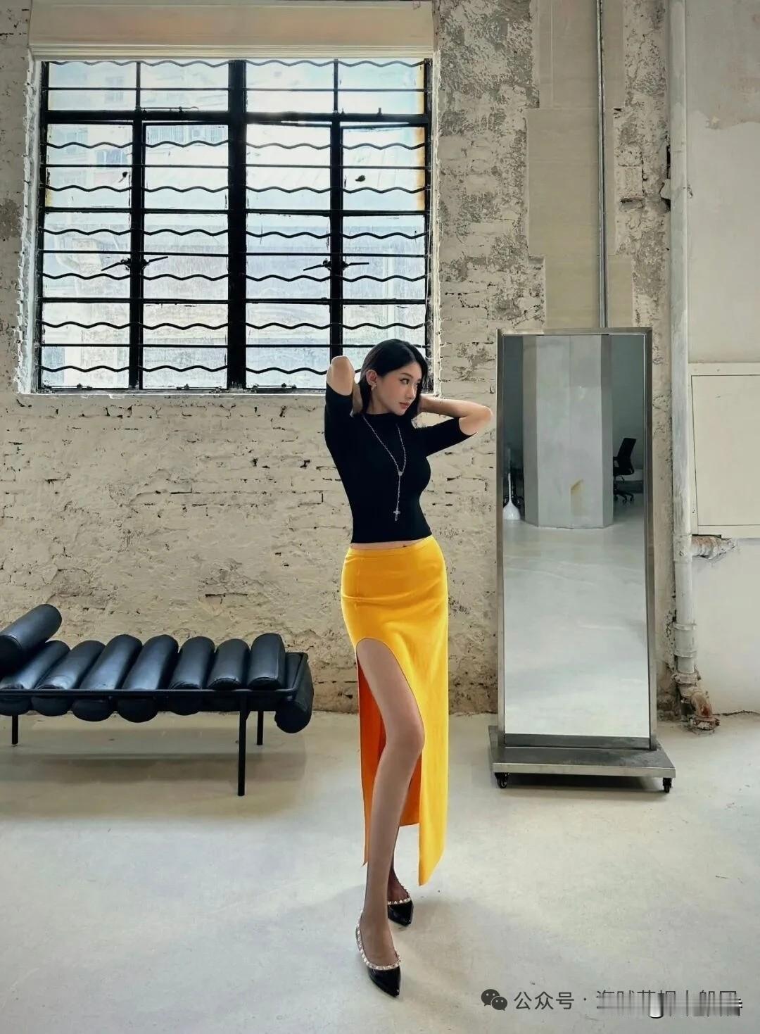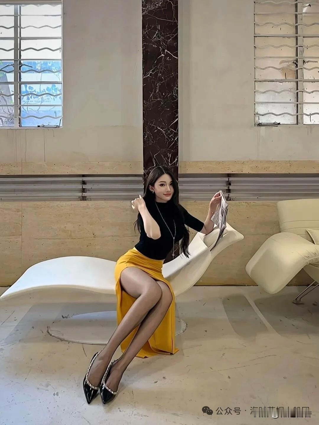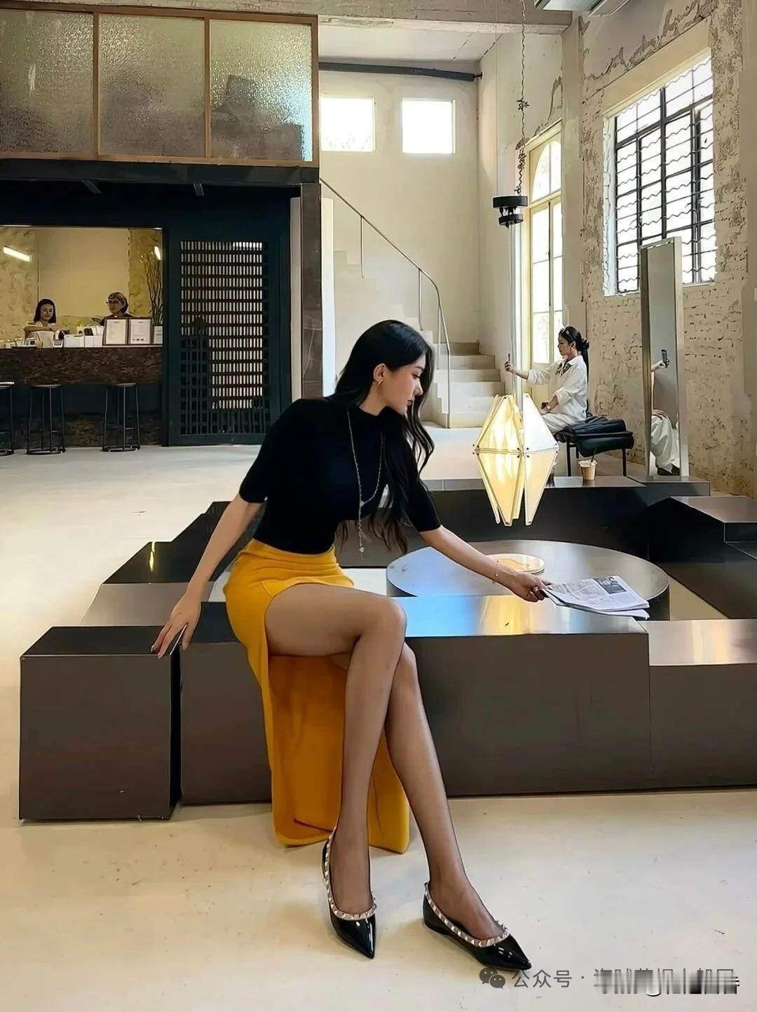 优雅黑裙与亮黄裙摆的完美搭配,时尚杂志阅读的悠闲时光。