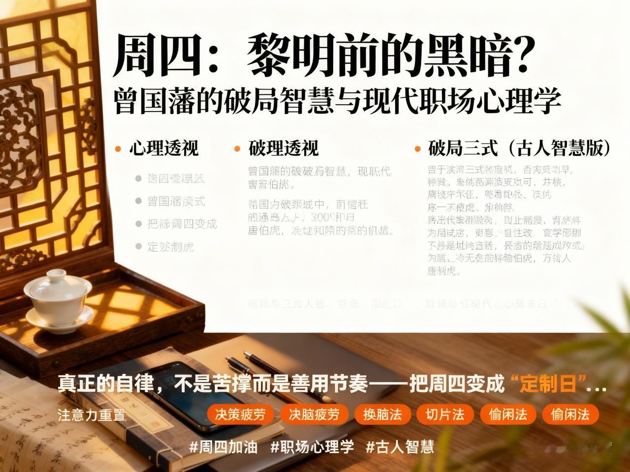有没有觉得,周四是最难熬的一天?周末仿佛触手可及,却又隔着漫长的24小时… 这感觉,像极了晚清名臣曾国藩的“黎明前的黑暗”。 他曾在日记中写道:“近日精神疲乏,诸事皆懒,此乃瓶颈之兆。” 但曾国藩的破局之法很独特——“午间小憩,醒后练字”。看似“不务正业”,实则是心理学上的 “注意力重置” ,通过切换思维频道提升下午效率。 🧠 心理透视:周四倦怠的真相 心理学研究发现,周四下午3点是职场效率的 “最低谷” 。这是因为: 1. 决策疲劳:前三天大量消耗自控力资源 2. 期待焦虑:周末越近,对工作的耐心越少 3. 目标衰减:周初的冲劲到此时已消耗殆尽 💡 破局三式(古人智慧版) 1. 曾国藩式“换脑法”:午休后做15分钟喜欢的事(练字/听歌) 2. 苏轼式“切片法”:把下午工作切成“东坡肉”大小,完成一块划掉一块 3. 唐伯虎式“偷闲法”:刻意安排20分钟“摸鱼时间”,反而更能专注 真正的自律,不是苦撑而是善用节奏—— 把周四变成“定制日”:穿最爱的衣服,吃期待的午餐,用小仪式感渡过瓶颈期。 👉 你的周四续命秘诀是什么?是奶茶、摸鱼还是…?评论区等你的花式操作! 周四加油 职场心理学