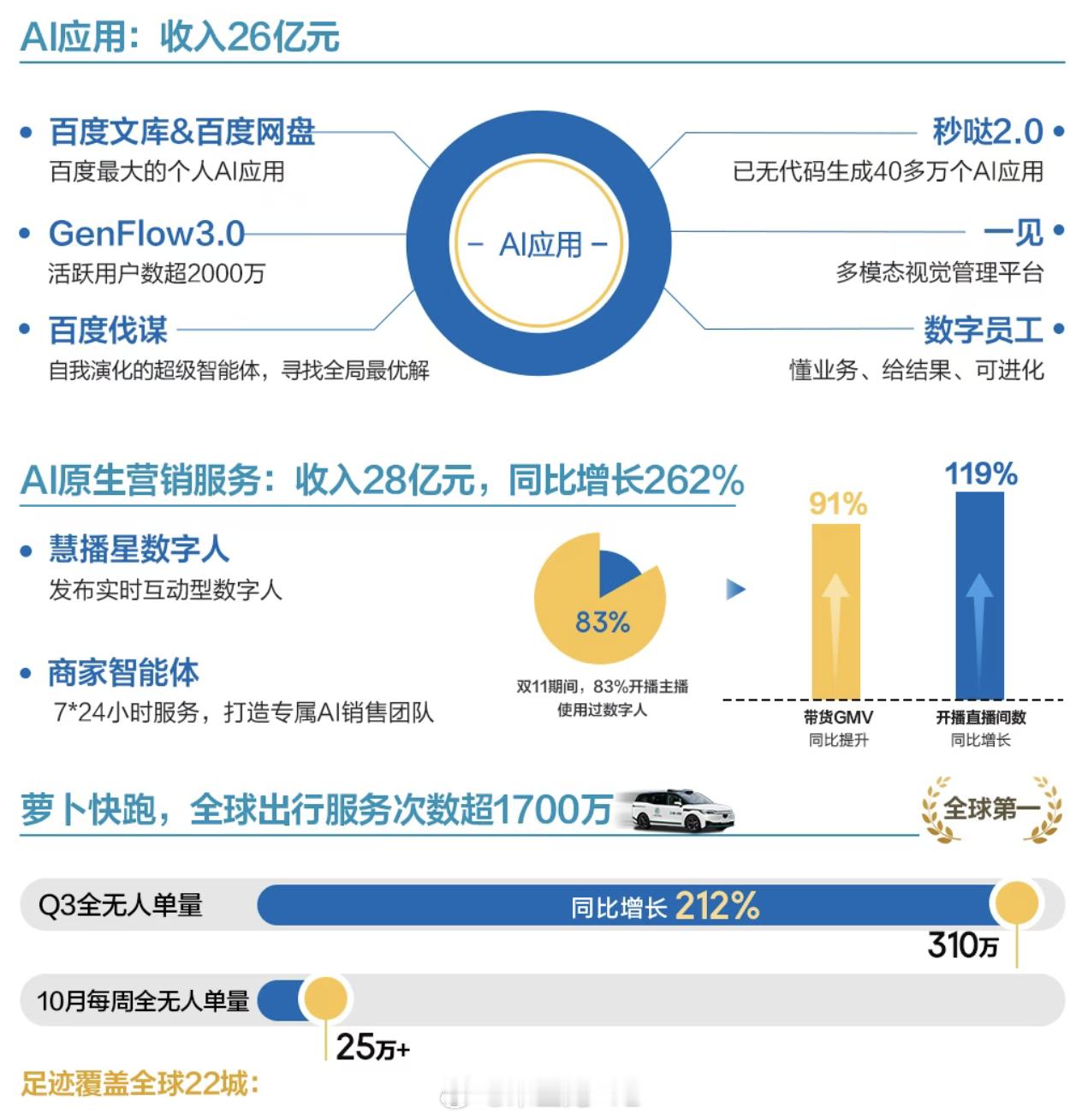 这波百度的三季度报告,很有特点。营收 311.74 亿元,同比下降 7%(创最大季度跌幅),最核心的利润业务在线营销(广告)收入 153 亿元,同比减少 18%。 所以现在围绕AI 业务来展开,AI业务收入,同比增长超 50%,达到约 100 亿元。AI云收入增长 33% (高性能计算订阅增长 128%);AI应用收入 26 亿元 (百度网盘AI月活超8000万);AI原生营销收入 28 亿元 (同比增长 262%)。 现在百度的考虑是和芯片和Robotaxi挂钩了,新一代昆仑芯(M100/M300,计划2026/2027年上市)和超节点产品“天池”;萝卜快跑全球出行服务达 310 万次(同比增长212%),累计超1700万次,成为全球第一的无人驾驶出行服务平台。