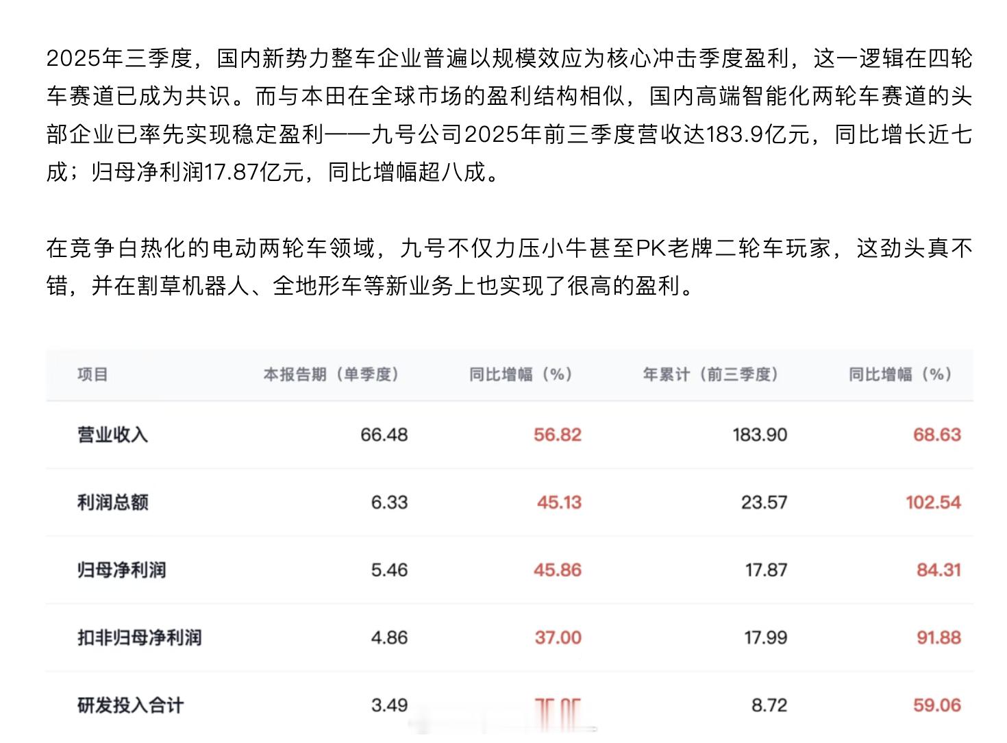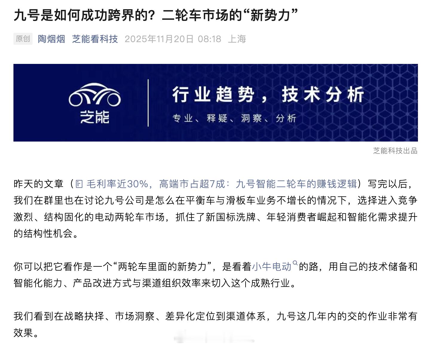 2025年成功的新能源车都是“平替”,差异点全被找了一遍,但都不足以脱离价格内卷。那么在外面能看到的之外,有没有一些不一样的事情呢。九号这家公司卷电动自行车赛道的故事,从平衡车、滑板车切入,一个“玩具厂”逆袭进入高度成熟、竞争固化的电动两轮车市场,并最终站稳脚跟,被称为“两轮车里的新势力”的公司。一个行业天花板不高(平衡车),渠道不强,品牌被固化的公司,却能在一个千亿规模、供给端高度分散但格局稳定的行业里,成功实现跨界重生。2017年前后,是九号的重要节点。平衡车市场见顶:是玩具,不是交通工具,低价竞争越来越激烈滑板车依赖海外:规模有限、政策波动性大,品牌固化为“潮玩”:在中国难以进入大众交通工具市场,九号积累了技术,却没有一个足够大的市场承载。 结构性机会:2019新国标落地,大量超标车必须更换,铅酸 → 锂电的大迁徙开始市场重新洗牌,用户年轻化、消费升级需求迅速增长,小牛电动这家创业公司做出“高端可行性”样板,两轮车高端智能化有需求,而且有溢价。这就像智能手机时代冲击功能机一样:原有行业稳定,但年轻用户的需求老玩家是看不到的。九号做第一台两轮车时用的是科技公司的做法:智能化是底层差异化,自研电控系统、智能钥匙、远程OTA、实时骑行数据、全栈能耗优化算法,这些能力在(电子)汽车行业很普通,但在两轮车行业属于降维打击。二轮车的行业习惯是“续航、载重、性价比”。年轻用户第一次觉得电动自行车也能像科技产品一样,用起来还自由,中年人可以送个娃方便九号在渠道与组织方式的差异,直营体验店 + 线上直达用户,渠道效率升高,品牌调性统一,用户体验和数据打通,可以像消费电子一样做“高端感”,在高线城市率先建立品牌认知,再通过线上渠道向下渗透,获得了高端市场最关键的第一波红利。一句话,这些汽车行业也都会,就是卷二轮车这种事,没人愿意干。在行业政策洗牌的节点,用科技公司的节奏,做了一次切入。这样的机会,也是需要天时地利的,执行力非常漂亮。