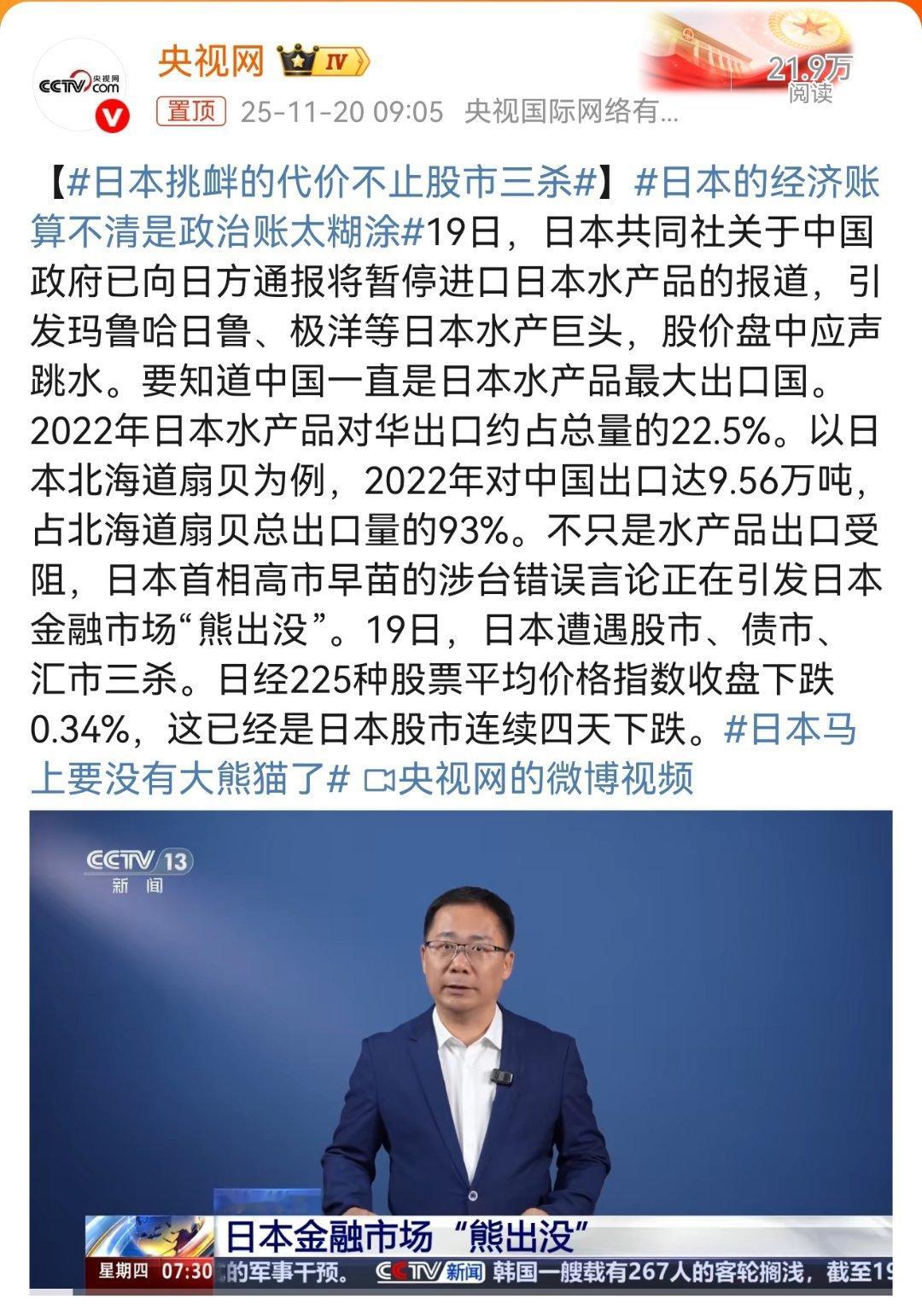 日本挑衅的代价:“三杀”之外更有难以承受之重日本政客涉台挑衅引发的代价,绝非股债汇“三杀”那般简单。日经指数暴跌1600点、日元创历史新低的背后,是旅游业2.2万亿日元损失的重创,是汽车、电子等支柱产业失去中国市场的隐忧,更是民意隔阂与外交僵局的深层危机。本就六季度首现负增长的日本经济,一边遭美国关税打压,一边又自毁对华合作根基。中方旅游预警、贸易管控的组合拳,精准击中其经济软肋。这场“政冷经更冷”的困局,是挑衅者无视历史共识的必然结果,也印证了:触碰中国核心利益,终将付出远超市场震荡的长远代价。