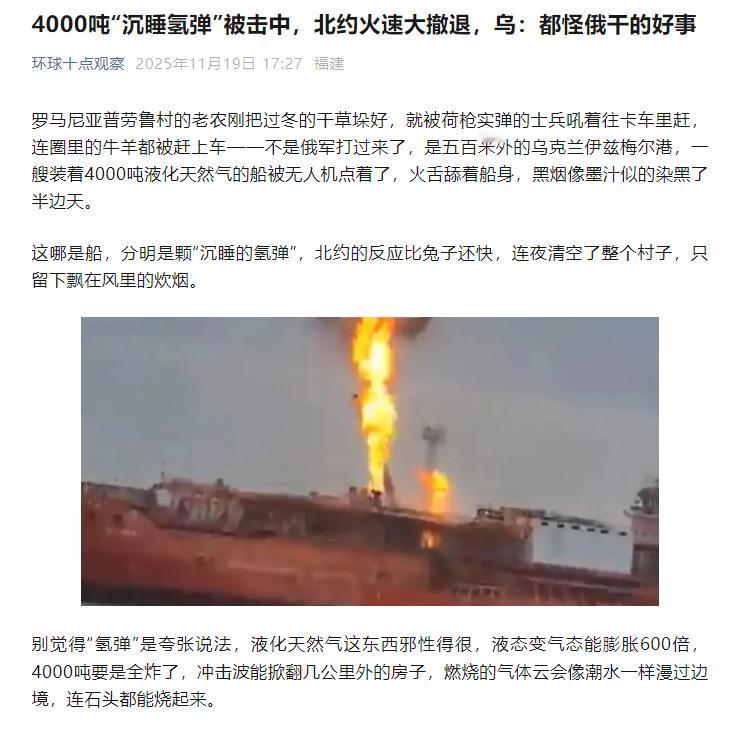4000吨“沉睡氢弹”被击中,北约火速大撤退,乌:都怪俄干的好事   俄罗斯新一轮的精准轰炸启动,港口4000吨“沉睡氢弹”被击中冒火,罗马尼亚紧急在周边进行疏散大撤退,乌克兰则痛斥俄罗斯的袭击行动。   先别被“氢弹”这俩字唬住,这玩意儿不是真的核弹,但论起破坏力,那可是一点不含糊,它其实是高危化学品硝酸铵。懂行的都清楚,这东西一遇热、一受震就容易炸。2020年黎巴嫩贝鲁特港,就2750吨硝酸铵炸了,直接把半个城市炸成了废墟,200多人当场没了。现在乌克兰港口堆着4000吨,相当于揣着个超大号“火药桶”,被击中后没当场炸翻天,已经算烧高香了。   俄军为啥非得盯着这个港口炸?答案说白了很简单,这儿就是西方给乌克兰送援助的“生命线”。最近这几个月,黑海的港口一直是俄军的重点打击目标,因为大量北约给的弹药、燃料和重型装备,都先在这儿卸船,再用卡车一批批拉到前线。   这次被砸中的港口更离谱,压根就是个“露天弹药库”,除了4000吨硝酸铵,还有一大堆北约给的155毫米炮弹、火箭弹,全乱哄哄堆在货场里,连个正经的防爆仓库都没有,这简直是给俄军“送人头”。   最有意思的是各方的反应。乌克兰总统办公室立马跳出来骂街,说俄罗斯是“故意炸民用设施”,可通篇没提港口里堆着的那些危险品和军火,提都不敢提。倒是罗马尼亚实在,眼看着火光把半边天都染红了,立刻启动紧急预案,把边境附近的老百姓和驻军都疏散了,连北约派在这儿的后勤人员都连夜跑路了,毕竟谁也不想被4000吨硝酸铵的爆炸冲击波掀上天。   其实但凡有点脑子的都能看明白,这事儿真不能全赖俄罗斯。俄军的打击目标很明确,就是冲着西方给乌克兰的军事补给线来的,这在战场上本来就是常规操作。真正该骂的是乌克兰自己,把几千吨高危化学品和军火混在一起堆在露天,既不搞防爆措施,也不远离居民区,这根本就是拿老百姓的安全当儿戏。贝鲁特港爆炸的惨状就在眼前,可乌克兰连最基本的危险品管理都做不好。   更让人琢磨的是北约,一边喊着“全力支持乌克兰”,一边真遇到危险跑得比谁都快。这些援助的弹药既然是北约送的,按理说该盯着乌克兰好好存着,可他们倒好,只管送不管管,眼睁睁看着乌克兰把港口弄成个“定时炸弹”。现在炸弹被点燃了,北约先顾着自己逃命,留着乌克兰老百姓在火边担惊受怕,这种“支持”,说难听点就是耍流氓。   目前港口的火还控制得住,没发生大规模爆炸,但这事儿已经给各方敲了警钟。对乌克兰来说,与其忙着甩锅,不如赶紧把危险品和军火的存放规范好;对北约来说,援助不能光喊口号,还得把安全风险考虑到;对俄军来说,打军事目标的同时,也得尽量别伤到老百姓。战场可不是过家家,把4000吨的“大炸弹”随便堆着,到最后坑的还是自己人。   目前港口的火势还在控制中,没发生大规模爆炸,但这个事件已经给各方提了醒。对乌克兰来说,与其忙着甩锅,不如赶紧规范危险品和军火的存放;对北约而言,援助不能只停留在表面,还得考虑实际的安全风险;对俄军来说,打击军事目标的同时,也需尽量避免平民伤亡。战场不是儿戏,把4000吨“火药桶”随意堆放,最终只会害人害己。