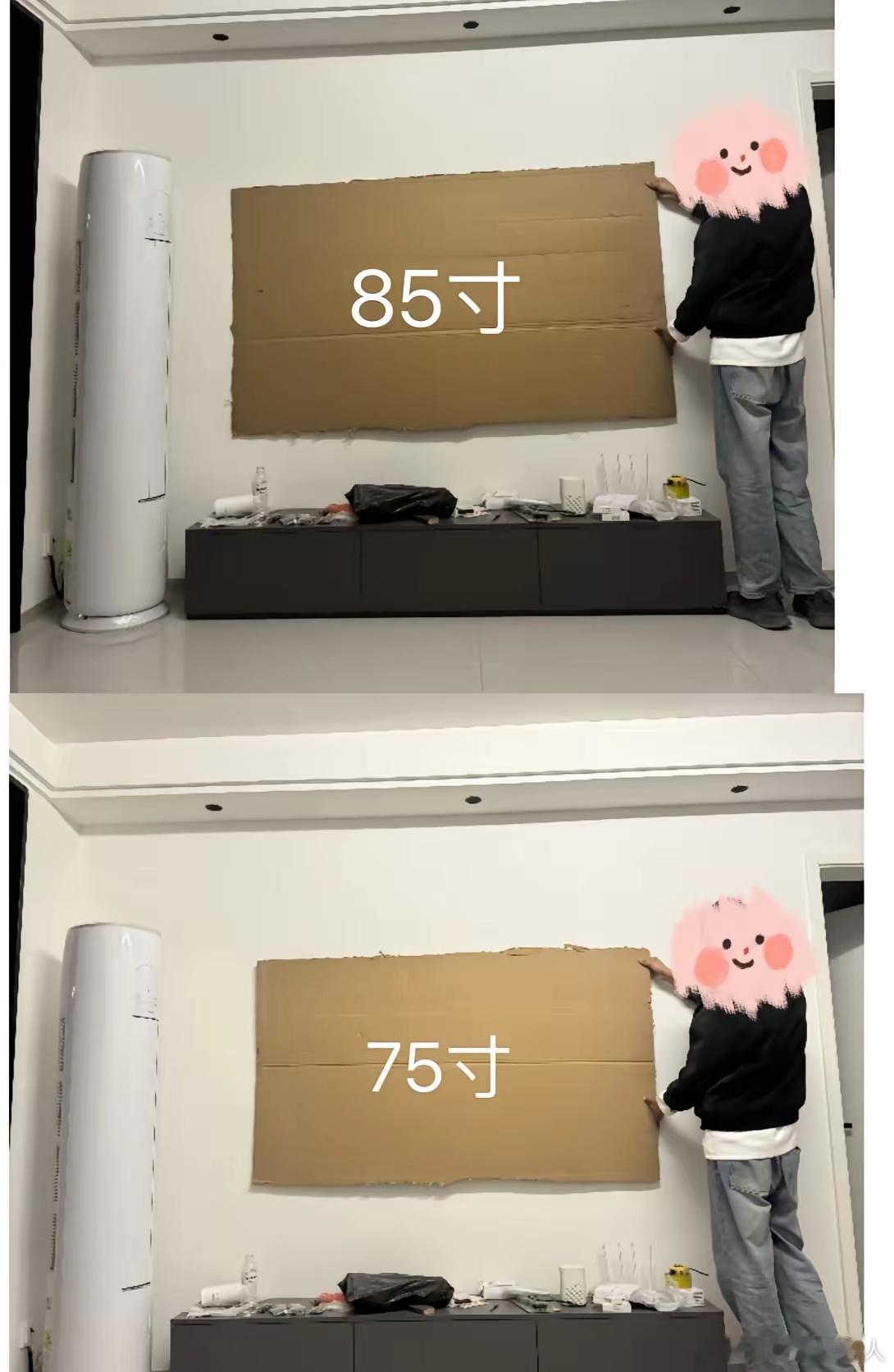 大家帮忙看看,买多大尺寸的电视合适?为了有比较,特意用纸壳剪出了电视的形状,让大家能更直观地感受一下。沙发到电视的距离大概在两米左右,现在真挺纠结的——差10寸,价格就差好几百块。85寸的会不会太大?75寸的又感觉有点小,选择困难症都犯了。大家给点意见,哪个更合适?