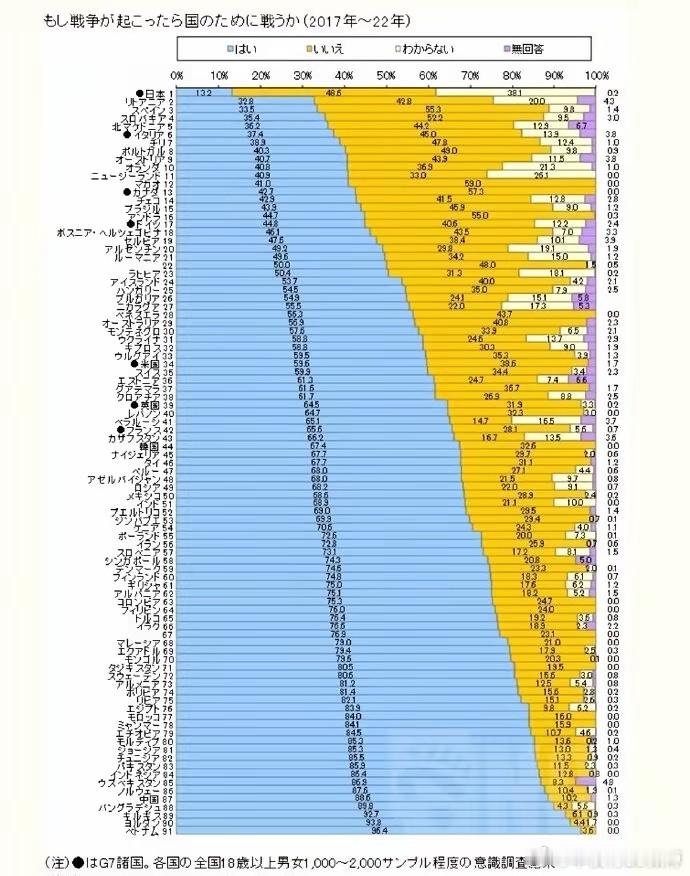 看这个民调:“如果战争爆发,你会为你的国家而战吗?”日本13.2%倒数第一。