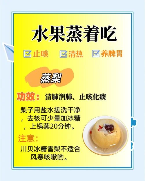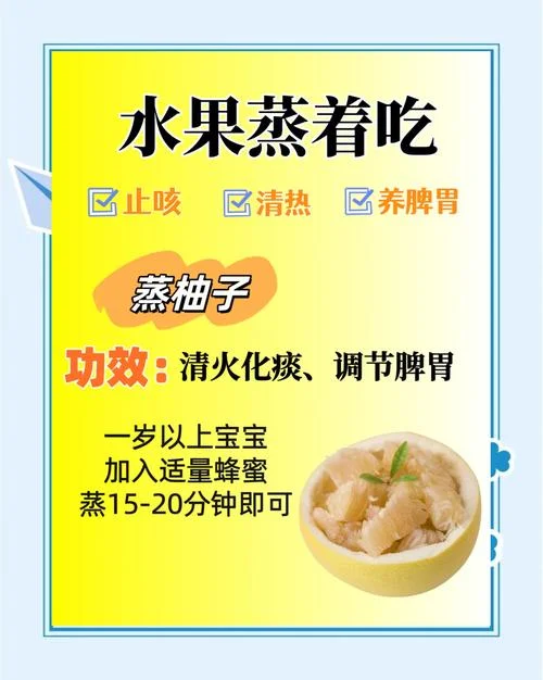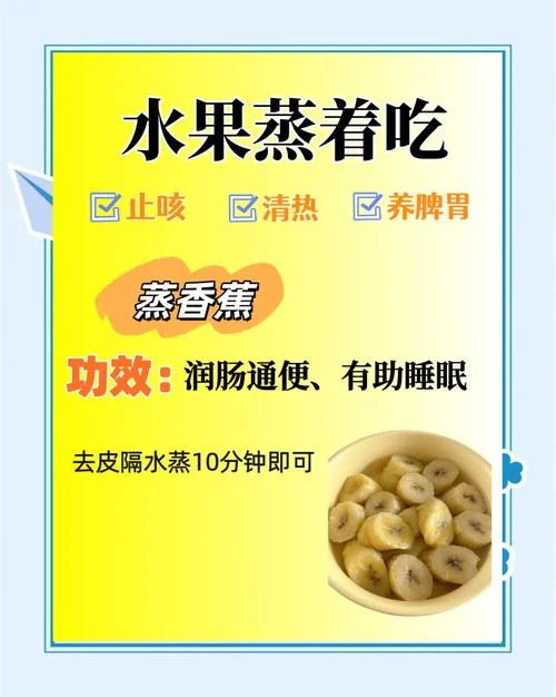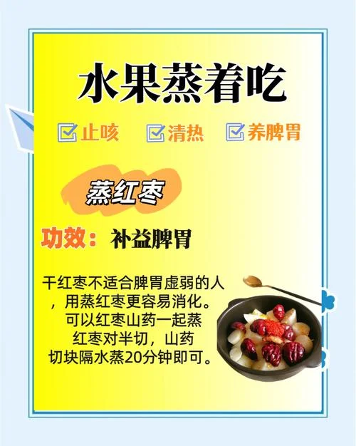 1.蒸苹果 润肺止泻、健脾养胃 2.蒸红枣 补益脾胃 3.蒸山楂 健脾养胃、开胃消食 4.蒸梨 清肺润肺、止咳化痰 5.蒸柚子 清货化痰、调节脾胃 6.蒸香蕉 润肠通便、有助睡眠