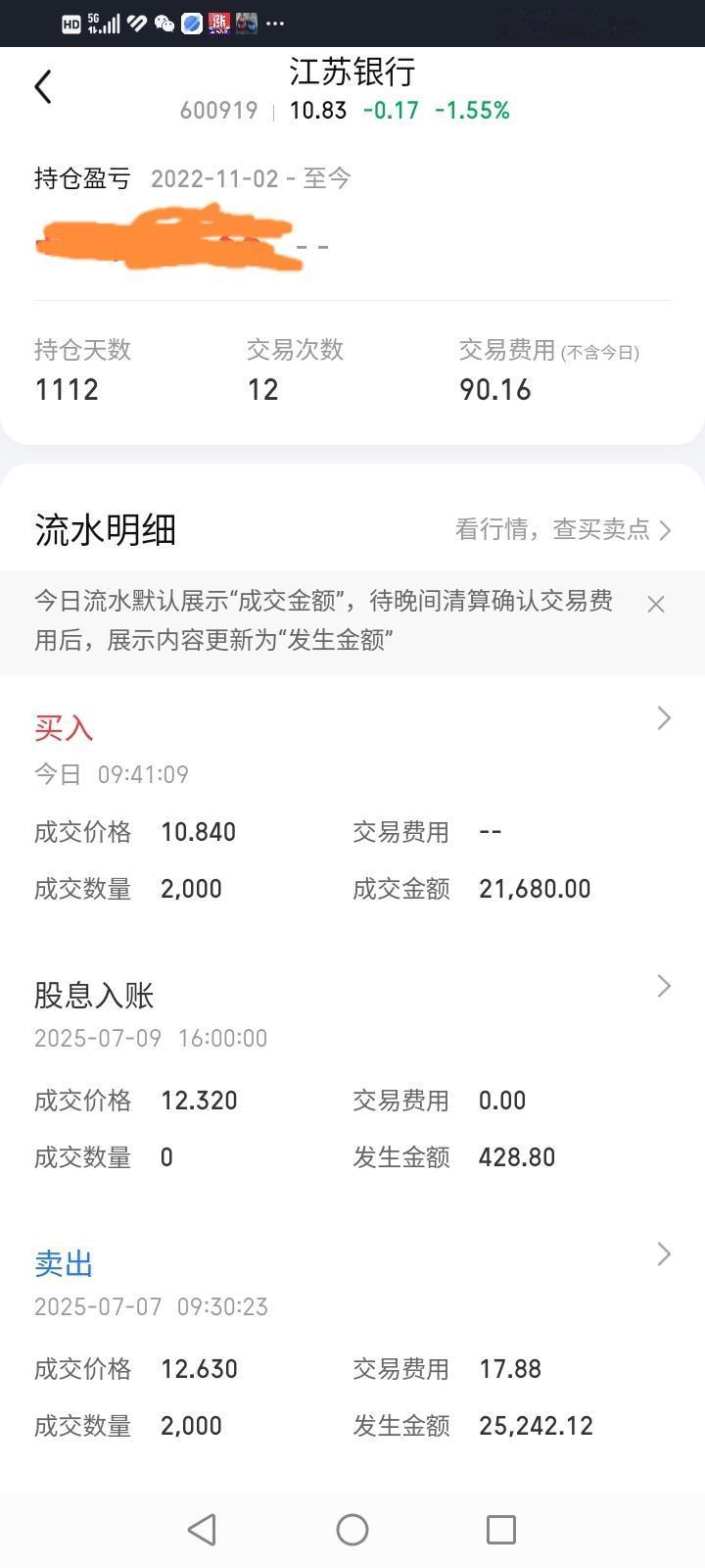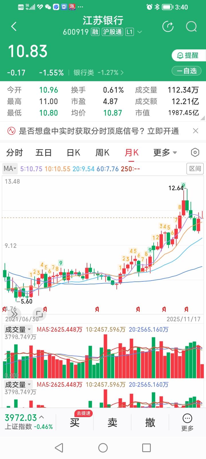 今天把江苏银行接回来了。成交价10.84元。 江苏银行最新动态市盈率4.87倍,