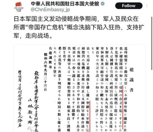 事情没有那么简单! 这一次我们驻日大使馆找出了日文原件!在高市早苗支持率大幅度拉升,日本国内声称必须要对中国来硬的,应驱逐中国的外交官,反击中国之后,11月15日,我们驻日大使馆发了一个日文原件,并配日文称,日本军国主义发动侵略战争期间,军人及民众在所谓“帝国存亡危机”概念洗脑下陷入狂热,支持扩军,走向战场。 说白了,这哪是日本跟我们较劲,分明是美国设的大圈套,想把日本、韩国、菲律宾当枪使,可他们忘了,我们东方大国根本不吃这一套! 最近日本那边闹得沸沸扬扬,高市早苗的支持率跟坐火箭似的往上蹿,国内一群人更是喊着要对中国来硬的,还叫嚣着要驱逐中国外交官,这阵仗看着挺唬人,实则全在别人的算计里。 11 月 15 日,我们驻日大使馆直接放出了日文原件,还配着日文说明,把话挑得明明白白,当年日本军国主义发动侵略战争的时候,多少军人和民众都是被所谓 “帝国存亡危机” 那套歪理洗脑,才陷入狂热,跟着支持扩军,最后一步步走向战场。 这可不是随便说说,有原件在这摆着,就是要让大家看清历史的真相,别再被某些别有用心的人带偏了。 大家可千万别以为这只是日本单方面的折腾,这背后的水深着呢!这根本就是一个局,摆棋的人远在大洋彼岸,就是美国。 你想啊,美国先暗中撺掇日本这么一闹腾,故意挑动矛盾,结果呢?中国、俄罗斯还有朝鲜,因为日本的激进举动,自然而然就站到了一起,一致对日本发难。日本一下子被多方压力压得喘不过气,这时候他们就开始找 “靠山” 了,一个大踏步就想跑进北约阵营,觉得抱上北约的大腿就能安稳。 可美国的算盘哪止这么简单,他们还想着拉上韩国和菲律宾,让这两个国家也同步入局,把日本、韩国、菲律宾打造成亚太版北约的先锋部队。 美国这心思多明显啊,就是想让这些国家当炮灰,冲在前面跟我们对抗,而他们自己呢?躲在后面安安稳稳卖军火,赚得盆满钵满。 之前特朗普在任的时候就老琢磨着这一套,现在看来,这算计大概率又要落空了,他们还是没搞清楚,现在的东方大国早就不是以前了,我们有足够的实力和智慧应对各种挑战,哪能让他们轻易把算盘打响? 就说最近吧,菲律宾在南海那边也跟着美国的节奏蹦跶,时不时搞点小动作,可每次我们都能有理有据地应对,让他们讨不到半点好处。 韩国这边,虽然跟美国走得近,但面对周边局势,也不敢真的完全跟美国一条道走到黑,毕竟他们也清楚,真要是成了炮灰,最后吃亏的还是自己。 日本呢,以为加入北约就能有恃无恐,可他们忘了,历史的账还没算清,周边国家对他们的警惕性从来就没降过,想靠着北约就能为所欲为,简直是异想天开。 我们驻日大使馆放出日文原件,就是要撕开这层伪装,让更多人看清美国的真实目的,也让日本民众明白,别再被军国主义那套东西忽悠,跟着美国一条道走到黑,最后只会把自己国家拖进深渊。 现在的国际局势复杂得很,但不管他们怎么设局,我们只要保持清醒,站稳脚跟,就不怕任何挑战。 本文仅为个人对当前局势的解读与看法,不代表任何官方立场,大家对这件事有什么不同的想法和观点,欢迎在评论区一起讨论交流。