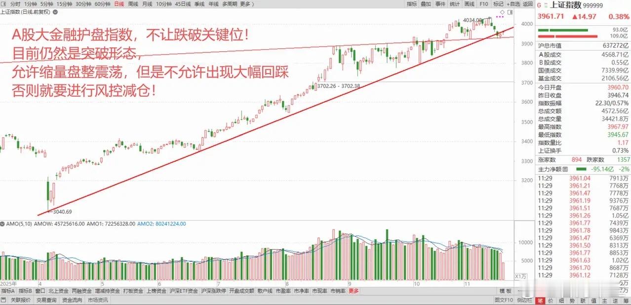 英伟达业绩大超预期,日韩股市大反弹!A股为何并未跟涨? 1、美股止跌回稳,温和上涨! 昨夜美国自动数据处理公司(ADP)发布了周度私营部门就业数据,就业市场呈现出招聘低迷;且劳工部公布的初请失业金人数增加,市场认为美联储12月降息的意愿有所反弹,美股三大指数结束四连阴,昨夜止跌回稳了。道指、纳指、标普500指数昨夜分别上涨0.1%、0.59%、0.38%。 2、英伟达3季度业绩大超预期! 到底美股科技股还有多少回调空间,还是会止跌反弹,其中昨夜美股盘后英伟达3季度的财报起了重大作用。而它的成绩单也足够亮眼,营收和净利润都超过了市场预期,黄仁勋还扬言:“云端GPU已经全部售罄,”反击AI泡沫论。昨夜英伟达上涨2.85%,财报公布后,盘后股价上涨5.08%,预计今晚美股AI相关科技股将大反攻! 3、日韩股市先涨一步! 由于欧美日韩股市的联动性和相关性,财报公布后,日韩股市恰逢开市,就先涨一波了。早盘日经225指数跳空高开1.22%,北京时间8点28分,涨幅一度达4.18%,午间12点,涨幅回落到2.51%;韩国股市直接跳空高开2.58%,午间涨幅仍然在3%以上。 4、A股和港股并未跟随 就像昨天欧洲日韩股市下跌,我们能够走出独立行情一样,今天也同样没有跟涨。港股恒生指数高开0.65%以后,午间涨幅回落到0.14%。恒生科技指数却大跳水,早盘高开0.7%,午间收盘却大跌1%。A股权重核心资产护住大盘不让跌,各大指数走出分化行情,上证指数午间收盘上涨0.38%,收在3961点。 5、大金融拉指数! 截止午间收盘,深证成指、创业板指和科创50指数分别微跌0.05%、0.52%、0.55%。上证指数虽然逆势上涨,但那是大金融在护盘指数的结果,银行股领涨1.9%,拉动上证指数翻红,另外保险和证券板块也涨幅居前。两市个股涨少跌多,上午2195只股票上涨,却有3089只股票下跌。 综上所述,现在A股大盘是处于突破以后的关键支撑位置上,只要能守好这个位置,缩量洗盘以后还能酝酿一轮上涨行情。但是只要这个关键位置一旦失守,股民就要进行减仓风控,防止下跌空间进一步打开的风险。目前还处于突破位的上方,但是不能继续跌了。 大盘的态度非常明朗,即便股票下跌,有银行股在护盘,也不想给指数下跌的机会!