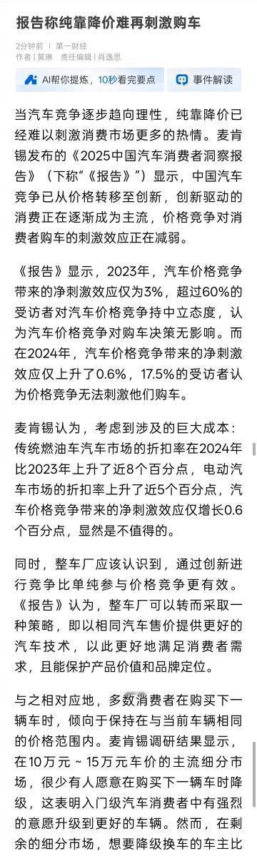 麦肯锡《2025中国汽车消费者洞察报告》显示,车市价格战已失效:2023-2024年价格竞争净刺激效应仅3%-3.6%,超60%消费者对降价无动于衷,17.5%受访者反而不受刺激。中汽协副秘书长陈士华警示,当前乘用车终端降价幅度大、新车定价普遍偏低,需高度关注。报告明确,汽车竞争已从价格转向创新,创新驱动消费成主流,车企需转向价值竞争。