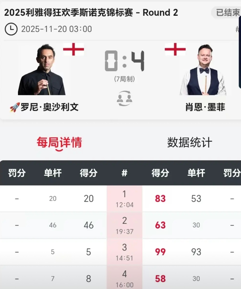 墨菲4:0横扫奥沙利文,晋级利雅德大师赛8强。下一轮,他将对阵赵心童。