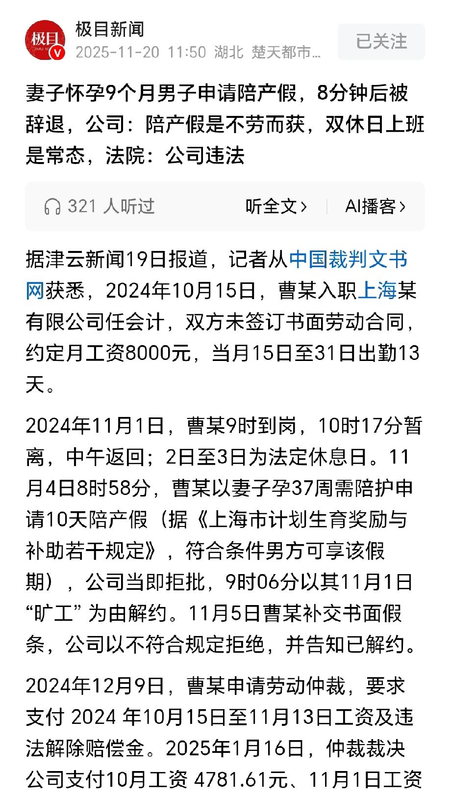 上海,妻子怀孕37周,眼看着马上就要生产,生活也不方便,男子按照当地规定向公司申请10天陪产假,没想到,公司不仅不批假,反而找了个“旷工”的理由开除男子。男子非常委屈,先后提起仲裁和诉讼,要求公司支付他的工资和违法解除合同赔偿金。公司:男子就是想借陪产假不劳而获,公司双休日上班是常态,男子周末没来上班,就是旷工。网友:难怪现在的年轻人都不敢生孩子,请个假太难了。 2024年10月15日,男子曹某成功入职了一家公司做会计,约定月薪8000元,但没签书面劳动合同。 曹某也没想太多,只要有份工作能养家糊口,合同签不签都不重要,他不在乎这些“虚礼”。 入职以后,曹某干劲十足,他知道家里妻子已经怀孕8个多月,眼看就到预产期,他得多挣点钱,给即将出生的宝宝攒奶粉钱。 之后的半个月里,曹某勤勤恳恳出勤13天,从没出过差错,本以为得到了上司的肯定,可没想到,一次陪产假,让他看清了公司的真面目。 11月1日,曹某像往常一样按时到岗上班,上午10点多临时出去了一趟,中午又赶回公司上班。 这本是再正常不过的工作节奏,却成了后来公司发难的“把柄”。 11月2日和3日是法定双休日,曹某按规定休息,正好照顾照顾怀孕的妻子,毕竟怀孕37周,行动不便不说,随时还可能生产。 曹某知道,上海这边有规定,男方可以享受10天的陪产假,为了让妻子能顺利生产,他打算周一上班找领导请假,安心的照顾妻儿。 11月4日一早,曹某刚到公司就提交了陪产假申请,想着这事儿应该顺理成章。 可他话音刚落,就被公司一口回绝,更让他震惊的是,短短8分钟后,公司就扔出了解除劳动合同通知书,理由竟是“11月1日旷工”。 曹某拿着通知书,实在有些不理解,他明明到岗了,怎么就旷工了? 妻子马上要生,正是需要人照顾的时候,自己不仅没拿到陪产假,还丢了工作,这不是让他雪上加霜吗? 曹某不甘心,11月5日特意补交了书面假条,可公司依旧不认可,还是执意认定他旷工。 公司简直太没人情味,只有赤裸裸的压榨,为了讨回公道,曹某申请了劳动仲裁,要求公司支付10月到11月的工资,以及违法解除合同的赔偿金。 一个月后,仲裁结果下来了,公司只需要支付拖欠的10月份工资4781.61元和11月1日的工资59元,并没有支持违法解除合同的赔偿金。 这个结果让曹某难以接受,公司明明违法开除,怎么还不用赔赔偿金?他当即决定起诉。 法院审理查明,曹某11月1日有明确到岗记录,公司说他旷工根本不成立。 更重要的是,公司用来解约的员工管理条例,既没证明是民主程序制定的,也没公示过,完全属于非法解除劳动合同。 依据《劳动合同法》第四十八条规定,用人单位违反本法规定解除或者终止劳动合同,劳动者要求继续履行劳动合同的,用人单位应当继续履行;劳动者不要求继续履行劳动合同或者劳动合同已经不能继续履行的,用人单位应当支付双倍赔偿金。 最终,法院认定公司属于违法解除劳动合同,公司需要支付曹某2N的赔偿金,共计赔偿8000元。 这一次,公司又不服,还提起了上诉,理由更是荒唐又离谱。 公司表示,曹某申请陪产假就是想借着这个机会不劳而获,甚至还声称公司双休日上班是常态,曹某周末不来上班,完全属于旷工,公司开除他完全属于合理合法。 然而,公司并没有提供新的证据,口说无凭,而且这样的说辞更是违反了法律强制性规定。 根据《劳动法》第三十八条规定,用人单位应当保证劳动者每周至少休息一日。 公司可以要求员工加班,但法律也有强制性要求,规定了加班的上限,也强制要求保障员工的休息权。 公司双休日上班是常态,这样的说辞完全是无视法律规定,侵害了员工的休息权。 更何况,二审法院也查明,曹某并不存在公司所说的旷工事由,完全属于违法解除劳动合同。 最终,二审法院维持了一审判决,驳回了公司的上诉,案件受理费也由公司承担。 劳动者的合法权益受法律保护,公司不能凭着主观推测就随意开除员工,更不能无视法律规定,把加班常态化当成理所当然。 陪产假属于员工的合法权益,更是保障下一代的健康出生,如果正常请假都难以得到批准,还被公司为难,哪个年轻人还愿意生孩子呢? 冬日生活打卡季