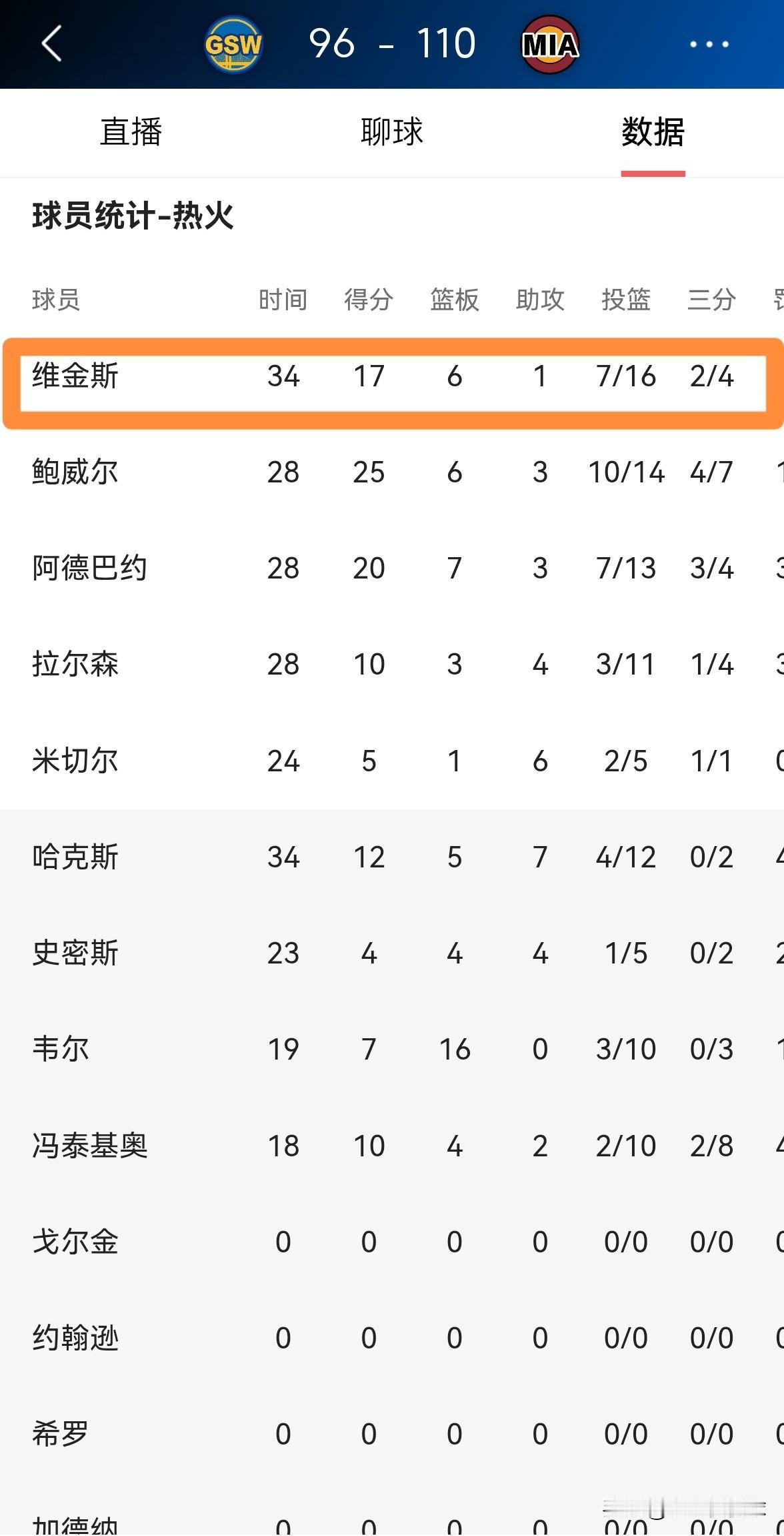 热火大将维金斯真是忘恩负义!在今天热火主场以110:96大胜勇士的比赛中,维金斯面对旧主打得极具侵略性,他在首发出战的34分钟里,投篮16中7,其中三分球4中2、罚球2中1得到17分6篮板2抢断,他的场上正负值为全队最高的+25。 众所周知,维金斯在效力勇士期间深受球队的重用,可是今天维金斯面对老东家却毫不手软。