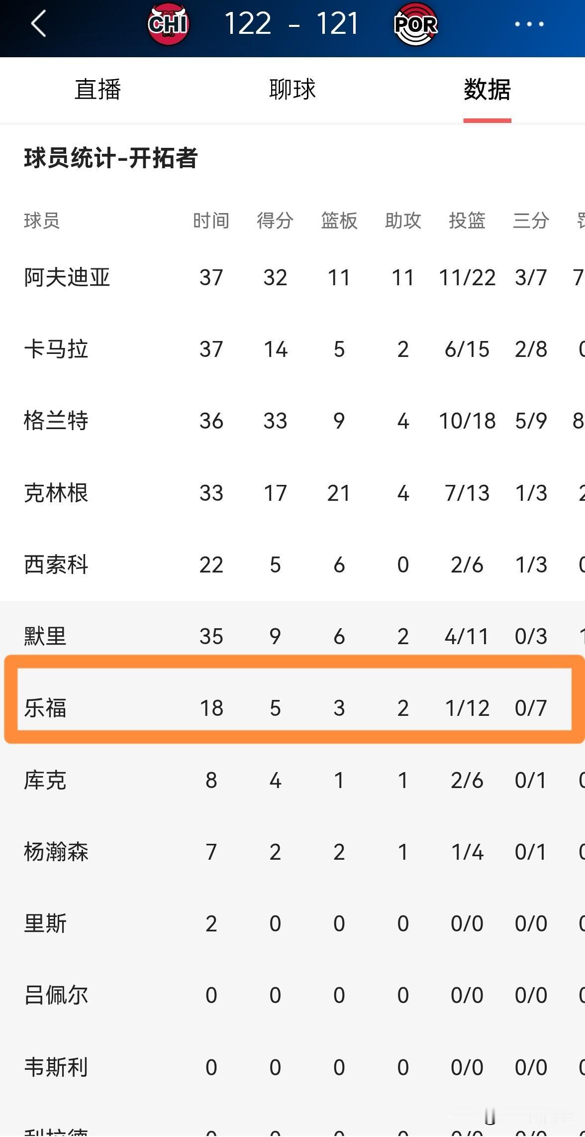 开拓者小将乐福真是铁到家了!在今天开拓者主场以121:122输给公牛的比赛中,乐福的手感冰凉到了极点。全场比赛下来,乐福替补出战18分钟,投篮12中1,其中三分球7中0、罚球4中3极为低效的得到5分,他的场上正负值为全队最低的-20。 不出意外的话,本场比赛过后乐福就将彻底的跌出球队的轮换阵容了,他的表现简直就是一场大灾难。