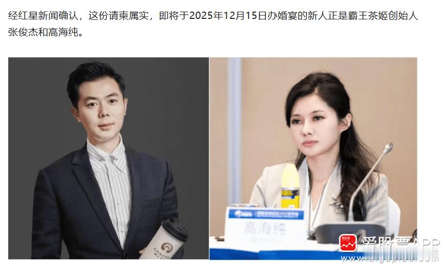 看大家心情不咋样,那就说点美好的事呗。今日一则具话题性的消息:霸王茶姬90后创始人张俊杰,迎娶天合光能“光伏女神”高海纯!目前天合光能市值为418.66亿元,霸王茶姬市值185亿元,两家公司市值合计超过600亿元。奶茶圈和光伏圈搞梦幻联动,爱股君有一个大胆的想法,大婚当天能人手送大家一杯奶茶吗?霸王茶姬创始人张俊杰简直是爽文男主。从奶茶店员工做起,到现在到年入百亿,成为上市公司掌舵者...!真正的白手起家代表,现在又要迎娶白富美。所以大家好好炒股吧,行行出状元,你要炒的像陈小群一样好,也能迎娶白富美的。(爱股君)