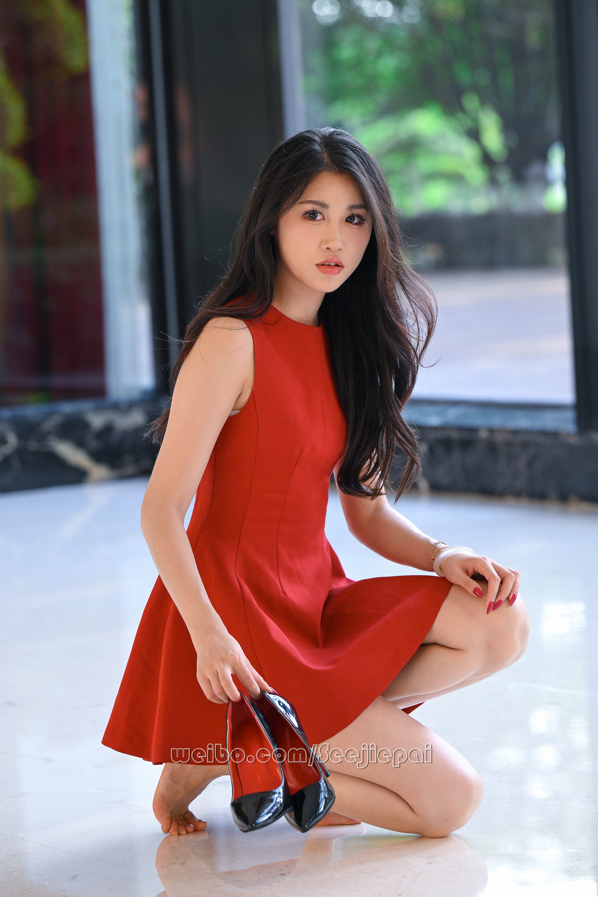极品模特红裙黑丝写真性感黑丝美女黑丝长袖连衣裙红裙女郎黑丝高跟御姐黑裙