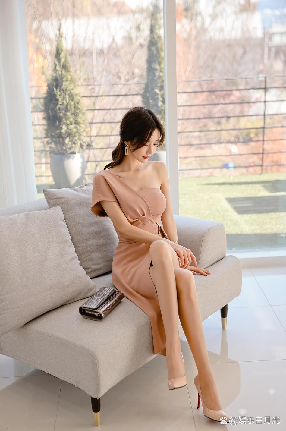 孙允珠,身着一袭裸色单肩裙,宛如从梦幻中走来的女神,恰到好处地露出一侧精致的香肩和优美的颈部线条,增添了几分小性感与妩媚。 她本身就有着超高的颜值和出众的气质。精致立体的五官,眉眼间透着灵动与温婉,红唇妆容更是点睛之笔,为整体造型增添了一抹明艳动人的色彩。一头柔顺的长发随意地披在肩头,散发着迷人的魅力。 阳光透过窗户轻柔地洒进来,映衬得她肌肤更加白皙。窗外的绿植郁郁葱葱,为整个画面增添了一抹自然清新的气息。她安静地坐在沙发上,姿态优雅,手边的手包也尽显精致,整体搭配和谐又时尚。