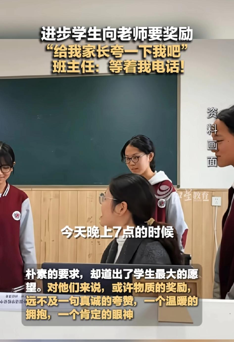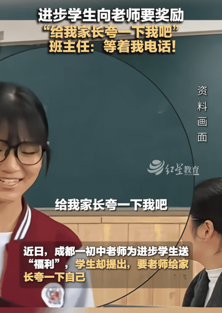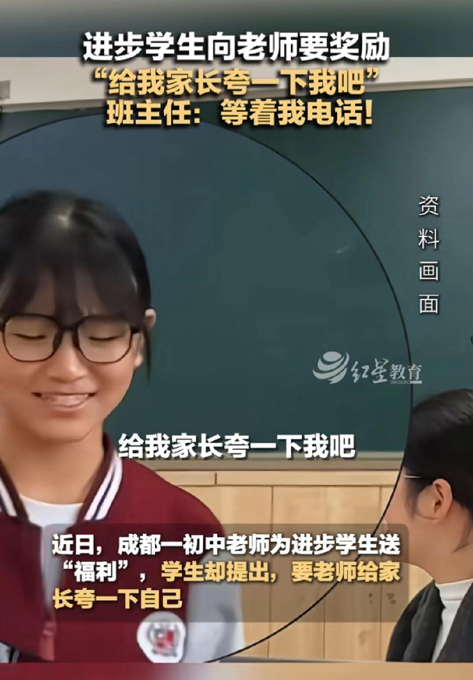 “真暖心啊!”成都,一所初中的教室里,刚刚拿到进步“福利”的学生,没有选零食也没要小礼品,反而笑着对班主任说:“给我家长夸一下我吧。” 没想到老师听完立刻笑着答应:“等着我电话!我定好闹钟,晚上7点给家长打电话。”简单的对话里,藏着学生最真实的期待。 比起物质奖励,被老师认可、让家长看到自己的努力,才是最让女孩开心的“礼物”。 此事引起网友热议,有网友说:“为什么我哭了,因为我对孩子要求太高了,原来她们要的其实很简单。” 还有网友说:“ 家长接完电话可千万不早说:别骄傲哦,要再接再厉,继续保持!这样真的会崩溃!” 也有网友说:“我妈说看到学校的电话就慌,接完电话一家人心情都是低落。” 其实,不管孩子成绩如何?好与坏,都是父母心中里的宝 。这个温暖的小片段,也让不少人想起自己读书时,那份想被在意的人看见成长的心情。 老师的一句肯定,不只是一句表扬,更是给学生攒足继续向前的底气。 老师的表扬,父母也能够得到欣慰,知道自己的孩子很努力 。 你会表扬自己的孩子吗 ? 晒图笔记大赛 (新华社)