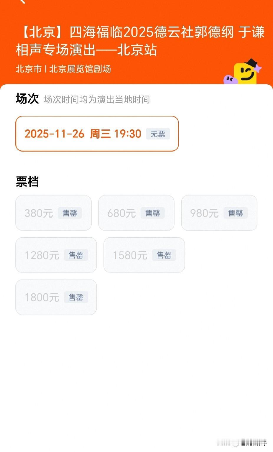 2025德云社的跨年专场依旧大受欢迎,离跨年还有一个多月,孟鹤堂周九良的南京站和郭德纲于谦北京站的专场票已经售罄。 岳云鹏孙越的苏州跨年专场还没有开票,虽然最高票价1599,目前预约的已经超过1万3千多人。 在相声市场低迷的情况下,德云社的这三组相声演员的票房好得让多少说相声的羡慕嫉妒恨! 加上今天官宣的张九南高九成的长沙专场,德云社的跨年专场目前已经官宣了八场,喜欢德云社的网友,你会去看谁的专场呢?