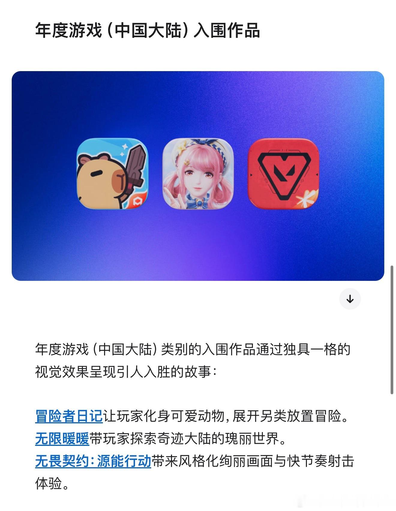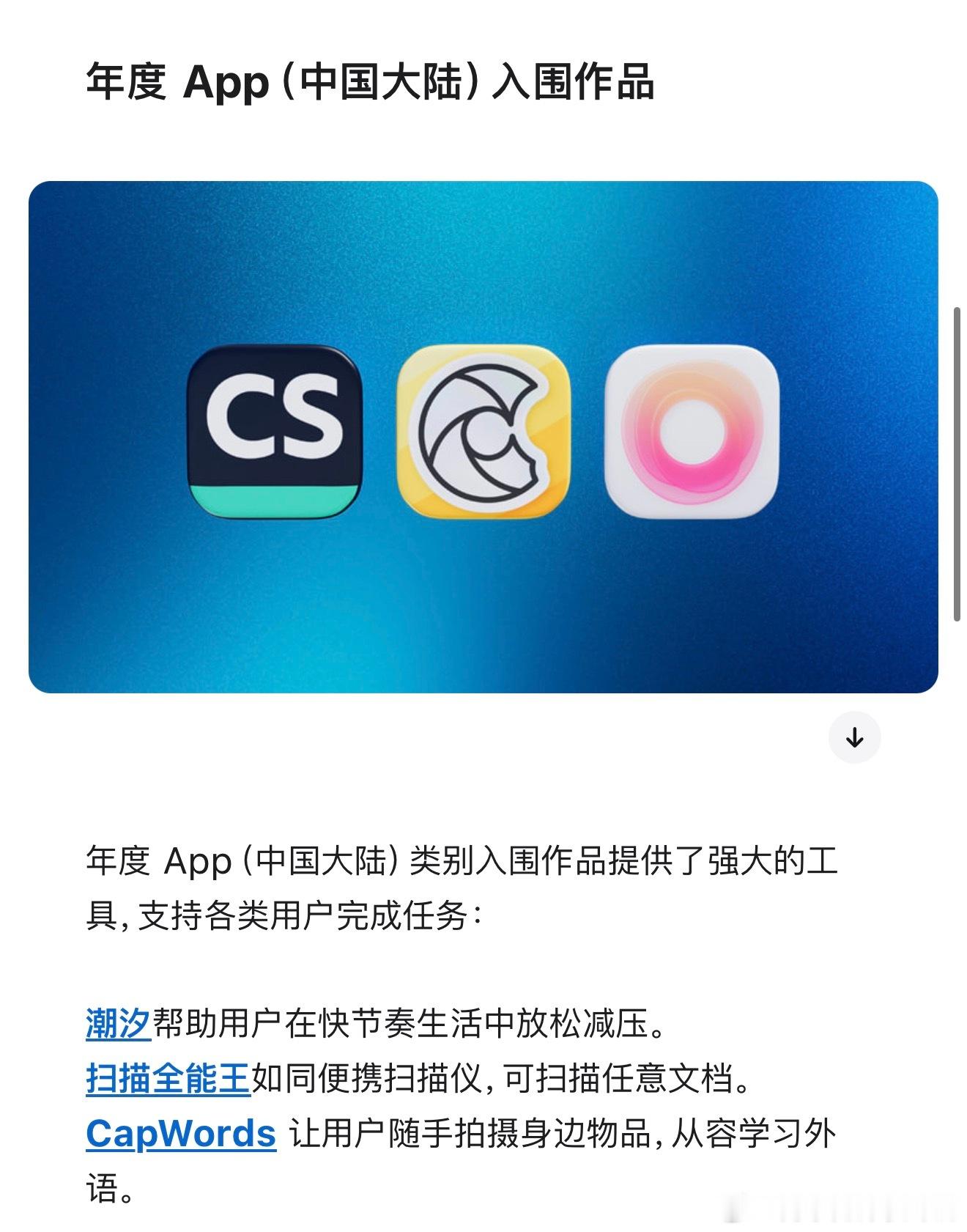 Apple 揭晓 2025 年 App Store Awards 入围作品,最终奖项会花落谁家期待一个Apple 公布了本年度 App Store Awards 的六款入围作品,表彰出类拔萃的 app 和游戏。它们所创造的卓越体验启迪用户取得更多成就、重塑日常工作流、突破创意极限。年度 App(中国大陆)类别入围作品🙋【潮汐】帮助用户在快节奏生活中放松减压。【扫描全能王】如同便携扫描仪,可扫描任意文档。【CapWords 】让用户随手拍摄身边物品,从容学习外语。年度游戏(中国大陆)入围作品【冒险者日记】让玩家化身可爱动物,展开另类放置冒险。【无限暖暖】带玩家探索奇迹大陆的瑰丽世界。【无畏契约:源能行动】带来风格化绚丽画面与快节奏射击体验。