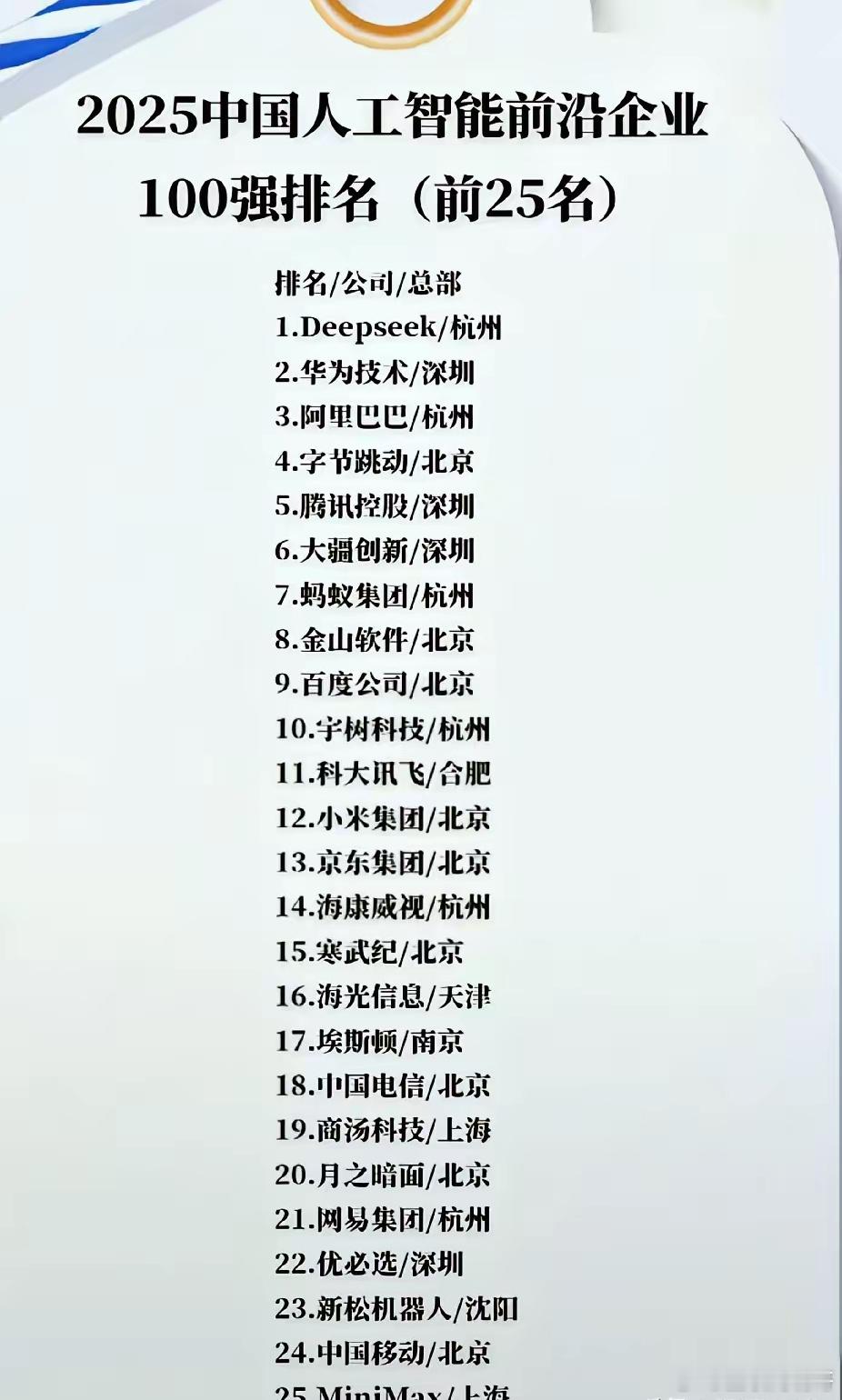 看了2025年中国人工智能前沿企业分布,在前25名中,北京和杭州居然占比最多,杭州居然能超过深圳,看来杭州这几年是下了功夫了,互联网的时代杭州是真的抓住了,看样子真的要冲击第四城的决心了,在看广州居然没有一个上榜,这真的不敢想象,四大一线之一,如今的广州怎么了?