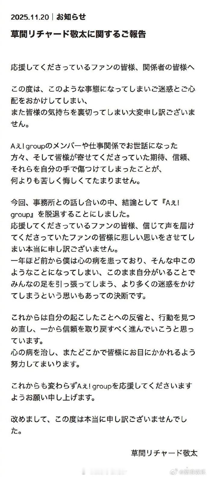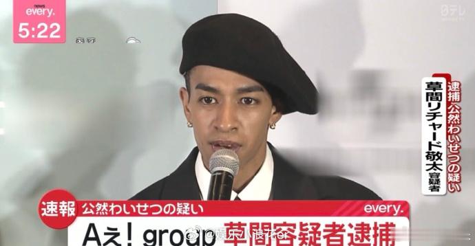 据日媒,Aぇ! group成员草间理查德敬太宣布退团,他表示从一年前开始患上了心理疾病,在这样的情况下发生了这次的事情(当街露下体)。他不退社,今后将继续作为 STARTO 旗下艺人开展活动。早前,他在东京新宿区当街暴露下体被逮捕。