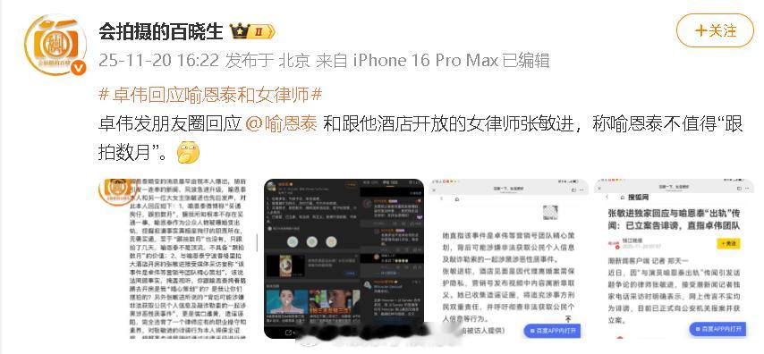卓伟发朋友圈回应喻恩泰和张敏进,说喻恩泰不具备跟拍数月的价值。