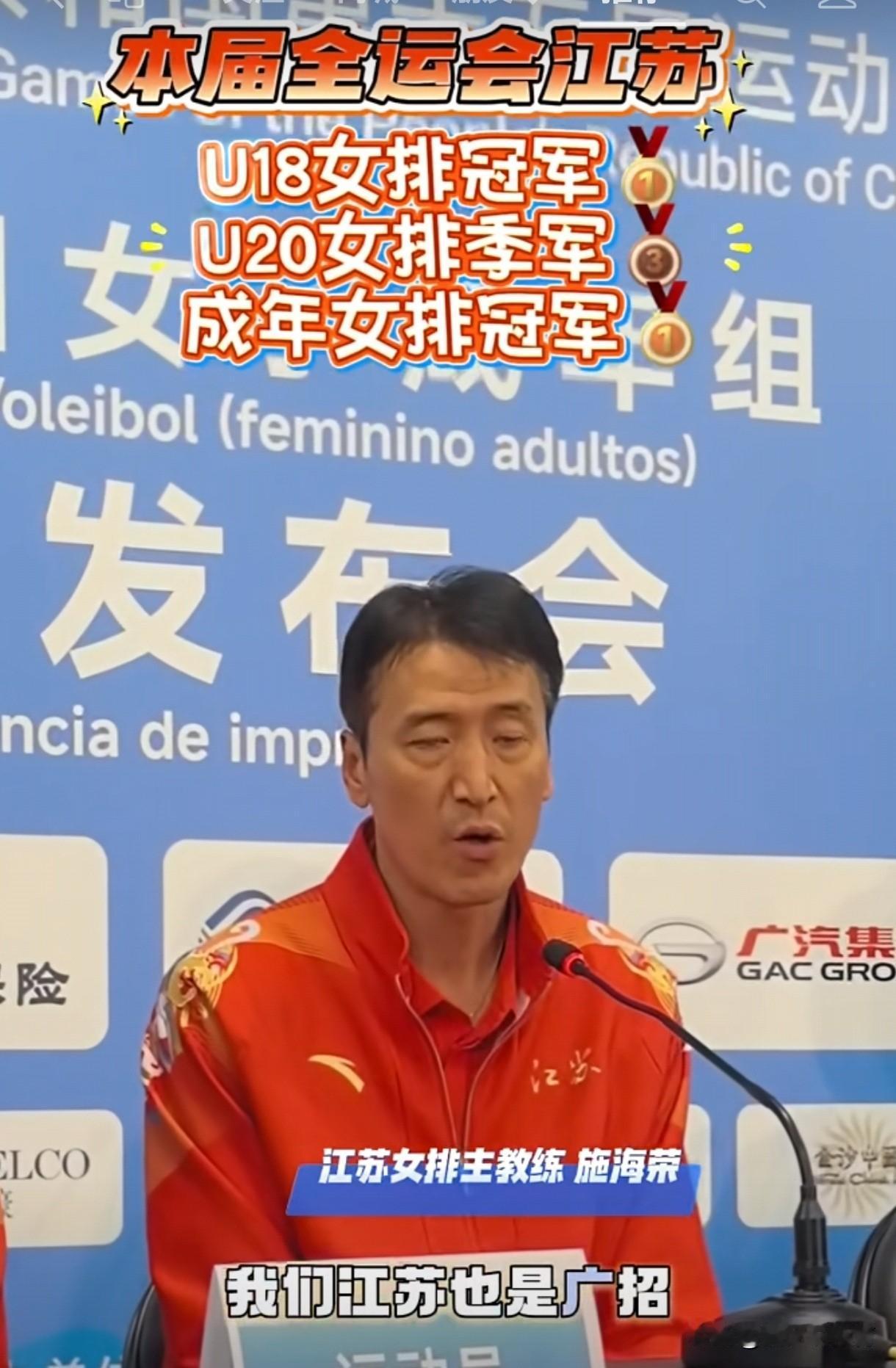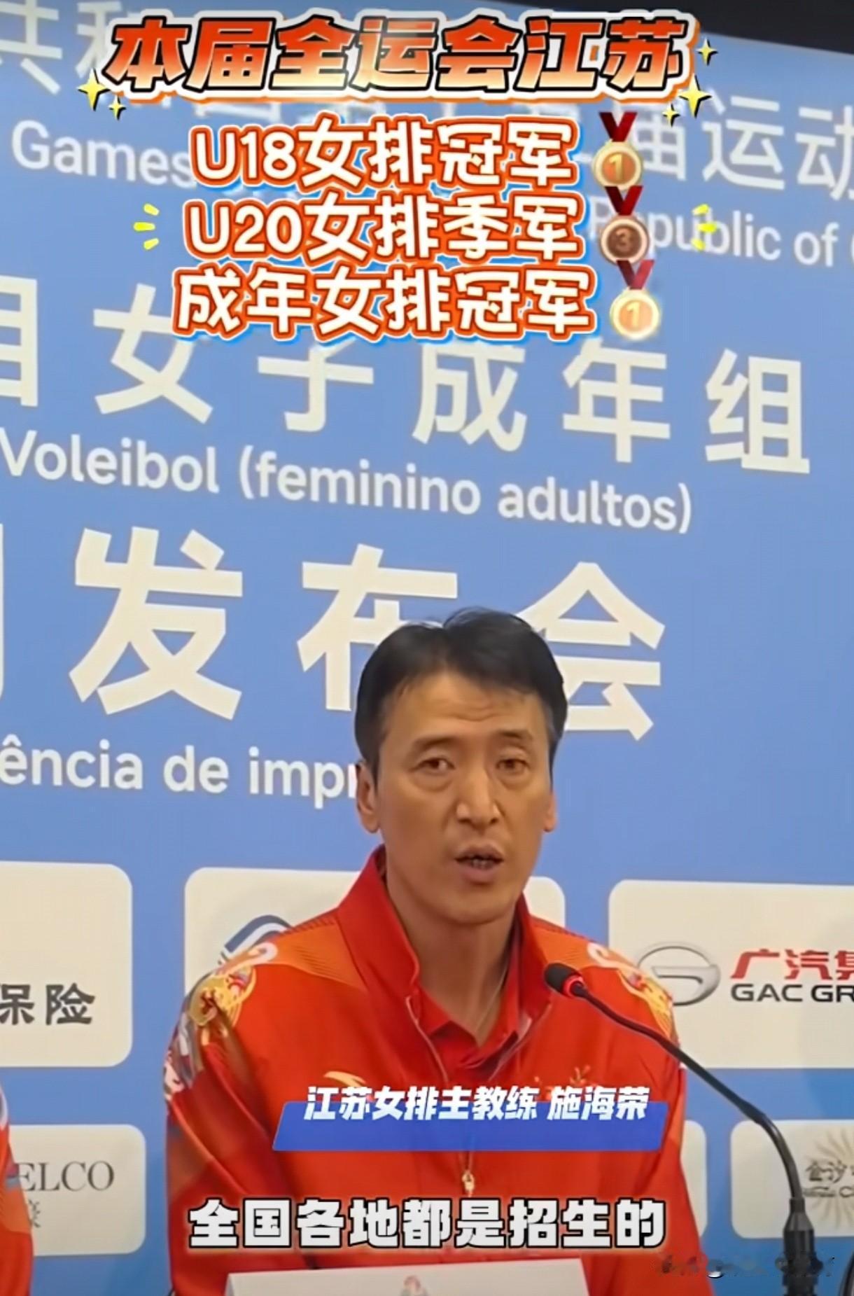 全运会金牌教练施海荣:江苏女排是面向全国招生的。江苏女排能够取得令人瞩目的成就,并且在本届全运会上保持全胜战绩夺取冠军,并没有固步自封,而是保持“请进来 走出去”的策略,以“源源不断为国家队输送人才”的核心目标,让队伍梯队建设站在全国的高度去发展江苏女排。其实江苏女排始终没有以“全苏班”为建队标准,像许若亚、杨珺菁、靳皓、包括高一佳、范泊宁等等队员,都是外省市球员。江苏梯队不仅与铁力一中、内蒙古包头一中等队伍有合作,还有新疆少数民族球员,甚至参与了新疆女排的组队建设工作。而在教练团队中,引入了日籍教练印东,包括像施海荣提及的沈富麟、李立军,以及此前的蔡斌等等国内顶级教练,吸纳他们的优秀执教经验,融入江苏女排的传统技战术体系,才有了如今强大无敌的江苏女排。江苏队始终站在高处,放眼未来,为中国男女排输送人才。金牌教练施海荣欢迎全国青少年球员到江苏学习、打球、谋发展。
