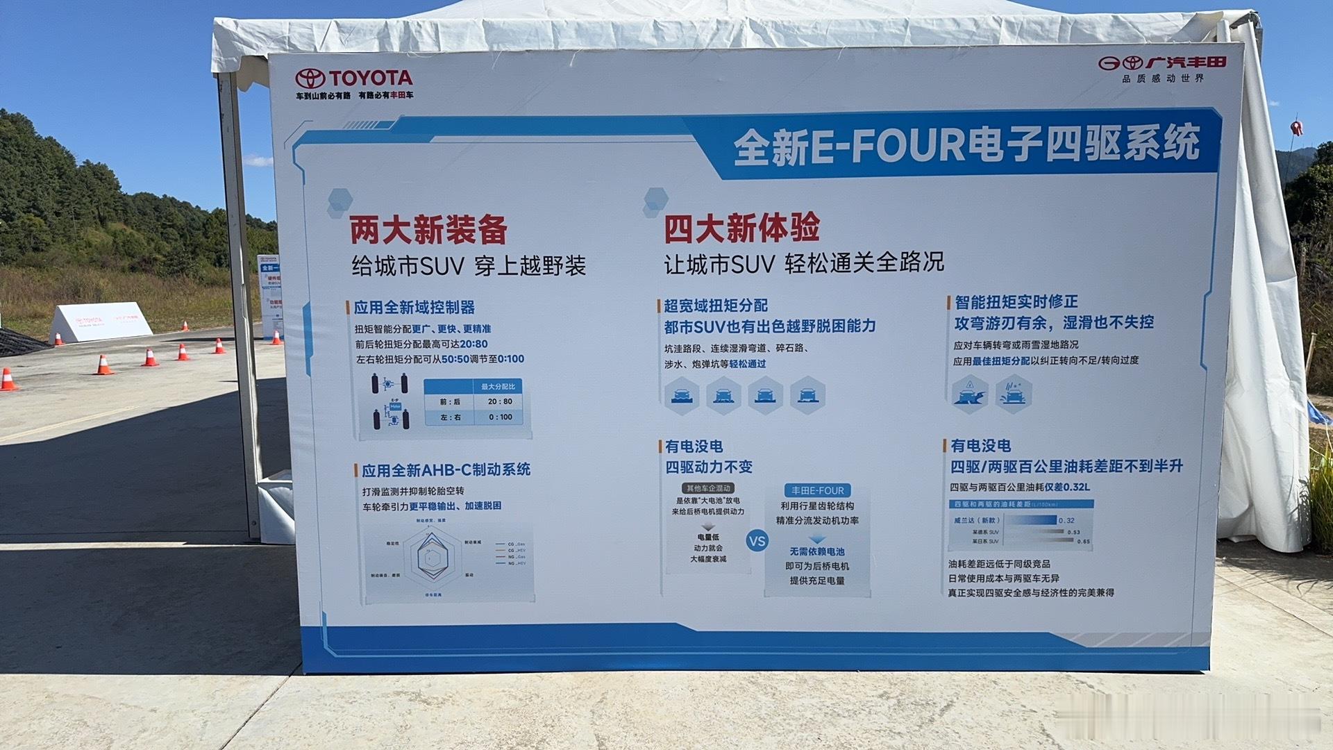 广州车展广汽丰田的主场,发布两台车新车 威兰达会有三个动力版本,2.0 2.0混动 2.5混动我们当时试驾的是2.5 混动,油耗低,城市开动力很不错,不过丰田混动的特色也就是极其优秀的燃油经济性,动力性能放在山区开还是差点儿,带坡度超过60kph就会费力点了。不过价格应该会有很大的惊喜,然后就是这代车型,在e-four的能力上做了非常大的提升了,现场摆了很多道具来实测电子限滑能力,越野模式开了后,电子限滑非常敏锐,车辆脱困能力极好。