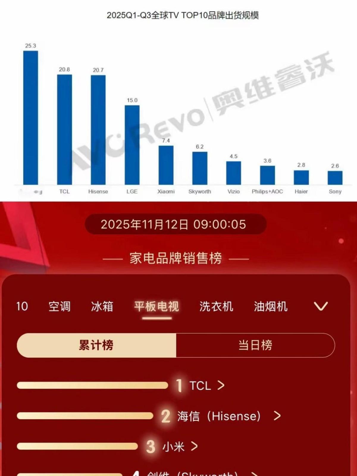 十年,在科技行业足以见证多次技术迭代与市场洗牌。而在显示领域,TCL用整整十年的专注深耕,印证了“技术破局”的深刻内涵——这需要的不仅是敢为人先的勇气,更是耐得住寂寞的持续沉淀。当行业陷入参数竞赛的怪圈时,TCL选择了一条更难但更正确的路:将SQD-Mini LED技术打磨成熟,为“何为好画质”这个根本性问题给出了扎实的答案。 在电视技术快速迭代的今天,一个核心的品类认知亟待厘清:高色域并不等同于高画质。这是评判一台Mini LED电视是否优秀的首要标准。当前主流市场主要存在两种技术路径:传统的RGB-Mini LED与TCL今年推出的SQD-Mini LED,它们的根本区别在于对画质理解的深度。RGB方案的核心是追求色彩范围的广度(即高色域参数),但它存在先天不足,易出现色彩串扰和光晕,使得实际观看的色彩纯净度和稳定性大打折扣。而SQD方案则致力于实现全局高色域,它通过“超级量子点”光源与“超级蝶翼华曜屏”的配合,实现了100% BT.2020全局高色域,并确保了任何画面下色彩都能精准、稳定地呈现。 除了色彩稳定性,画质的另一个核心维度是对比度。我们必须建立这样一个认知:没有高对比度和高亮度,就不能称之为一台好的Mini LED电视。Mini LED技术的优势,本就在于通过精细的分区控光来实现极致的明暗对比。在这方面,代表机型X11L展现了技术标杆的实力:凭借20736个万象分区与XDR 10000nits峰值亮度,它能够精准控制每一处光线的明暗,呈现深邃的暗场与璀璨的亮部细节,这才是Mini LED技术应有的价值体现。 这项历经十年沉淀的SQD-Mini LED技术,其价值已获得市场的广泛验证。行业数据显示,TCL在2025年前三季度斩获了“全球Mini LED出货量第二、中国品牌第一”的排名。同时,也荣登今年双十一竞速榜榜首。市场的反馈清晰地表明,当消费者逐渐认清RGB是实现高色域的一种方案,而SQD才是追求全局高画质的完整解决方案这一本质后,会自然而然地用选择为扎实的技术投票。双十一竞速榜第一名的战报与全球出货量排名,正是这场品类认知升级的最佳印证。 机皇降临 不颠覆不发布 这个双11TCL电视卖空了