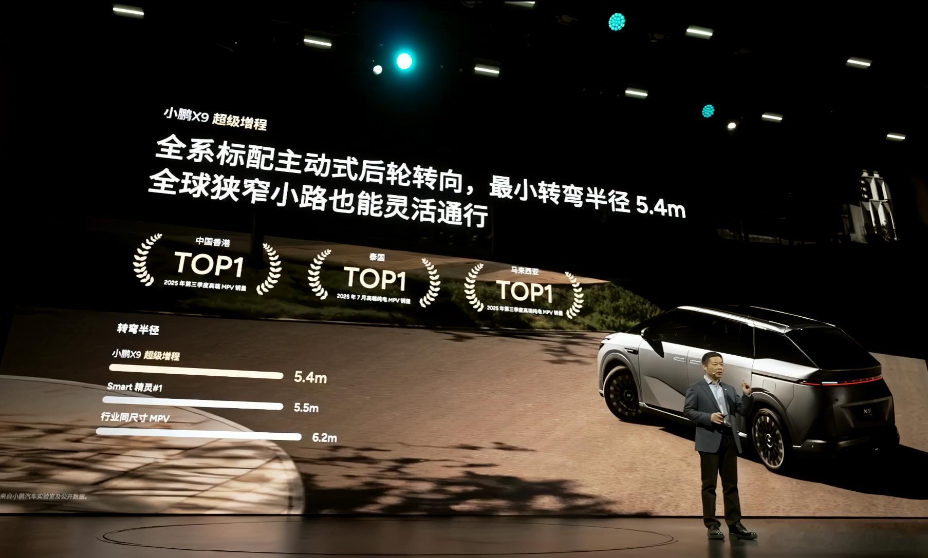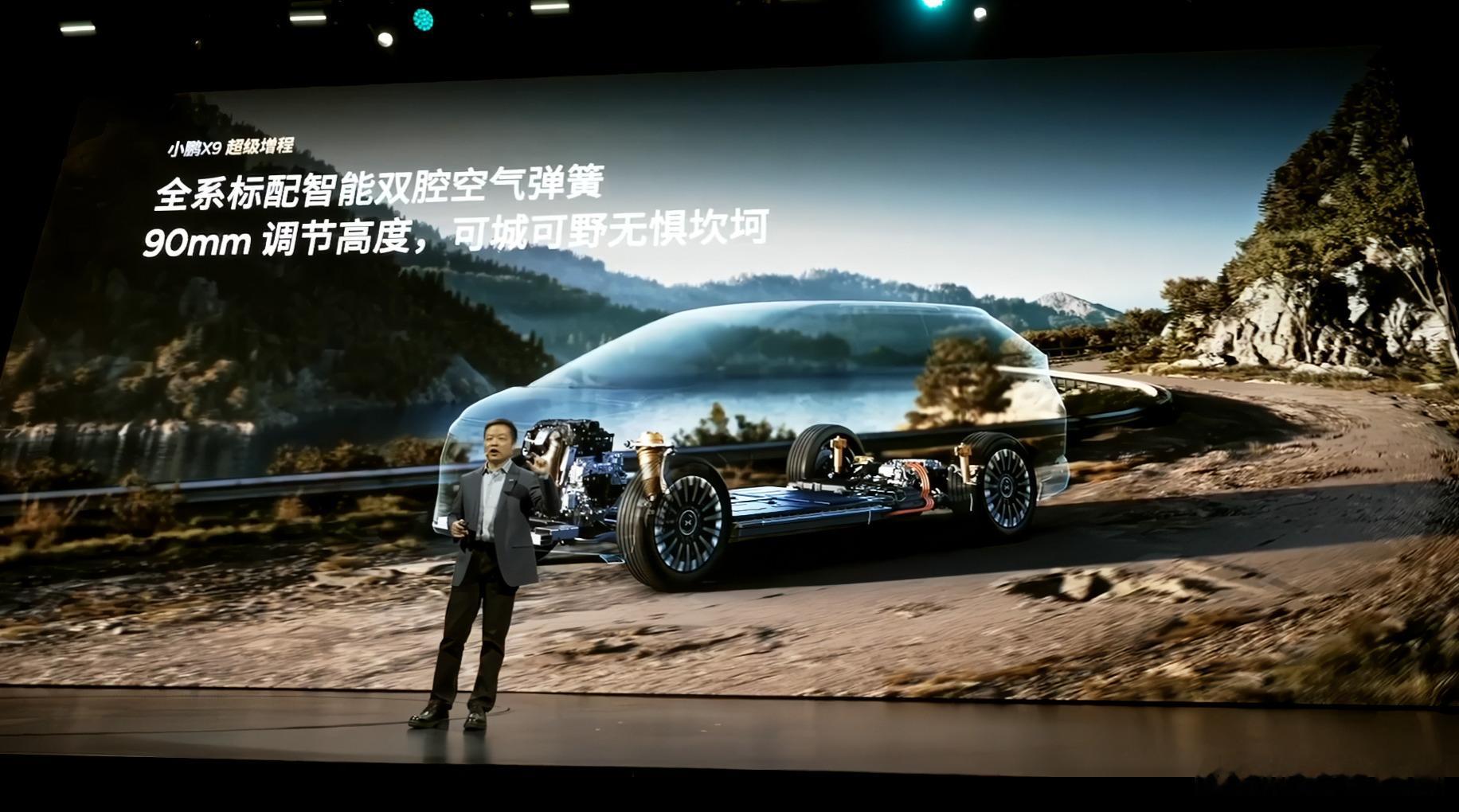 小鹏X9 超级增程,标配双腔空悬,90mm调节高度,标配后轮转向,最小转弯半径是5.4米