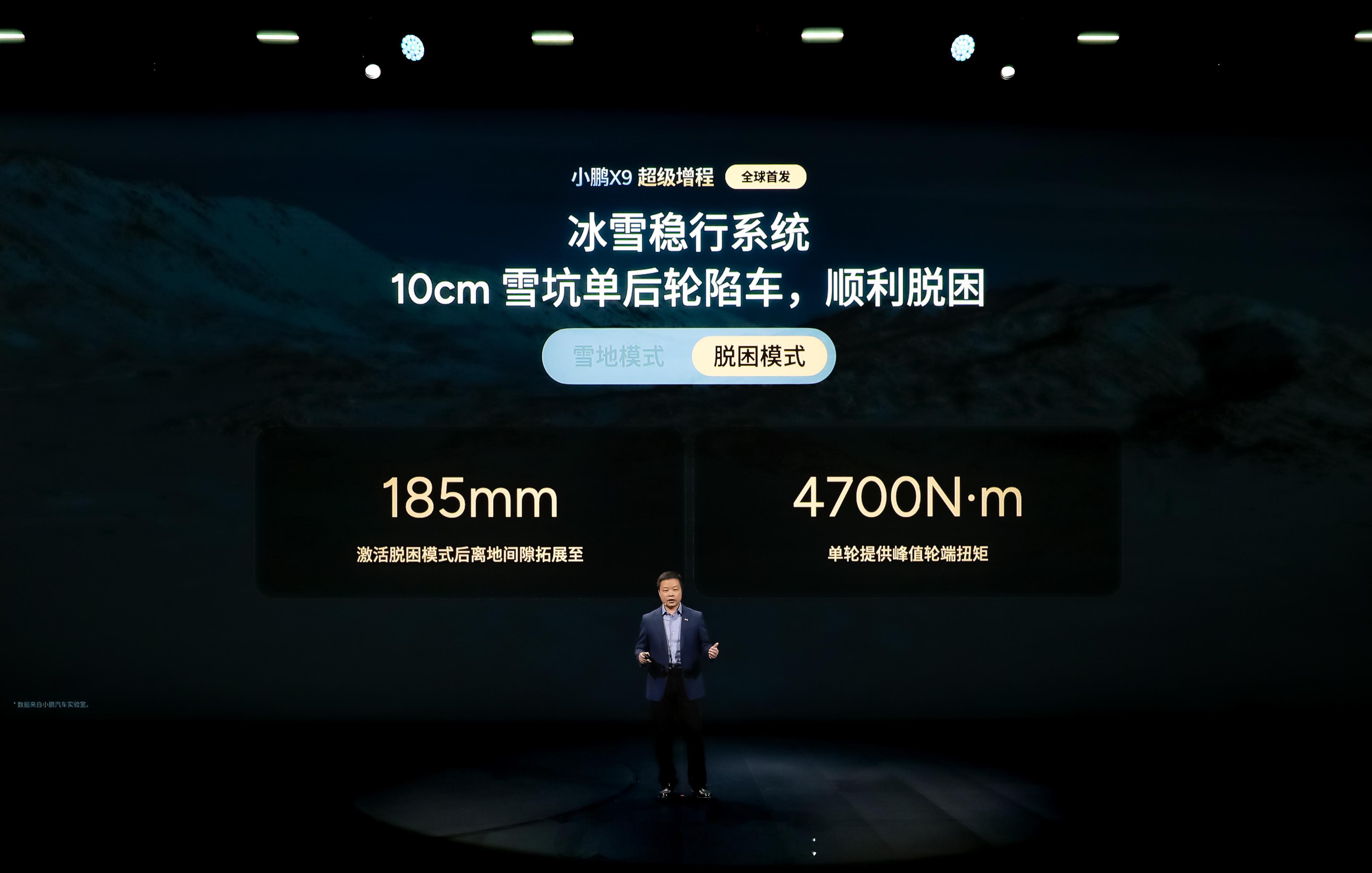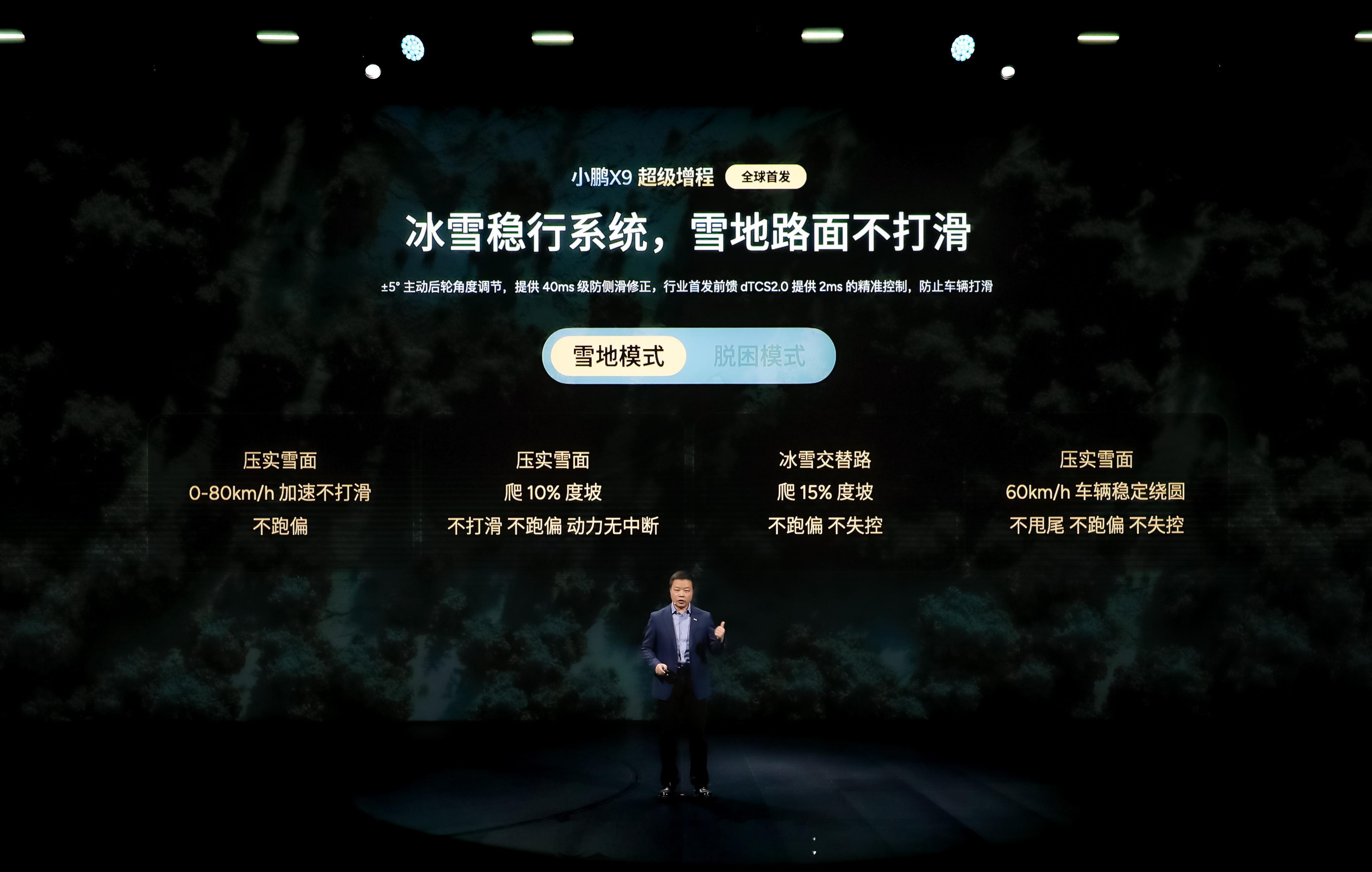 小鹏X9超级增程专为冰雪路况打造的冰雪稳行系统,在通过性、操控性与脱困能力三大维度全面升级。通过185mm最大离地间隙、40毫秒级防侧滑干预和2毫秒级扭矩控制,实现在雪地模式下压实雪面80km/h加速不打滑、10%雪坡爬坡不跑偏的稳定表现。脱困模式下,更可输出4700N·m单轮峰值扭矩,轻松应对10cm深雪坑陷车。为应对北方严寒气候,小鹏X9超级增程搭载的11源热泵智能回收系统,可高效回收动力系统及各部件余热,显著提升冬季续航表现。小鹏X9超级增程还历经800天跨越20国330城的2000万公里全球实测,在暴雨、戈壁、极寒等极端环境中持续验证,并针对雨淋、密封、悬架等系统进行专项强化,展现出全场景出行的卓越可靠性。