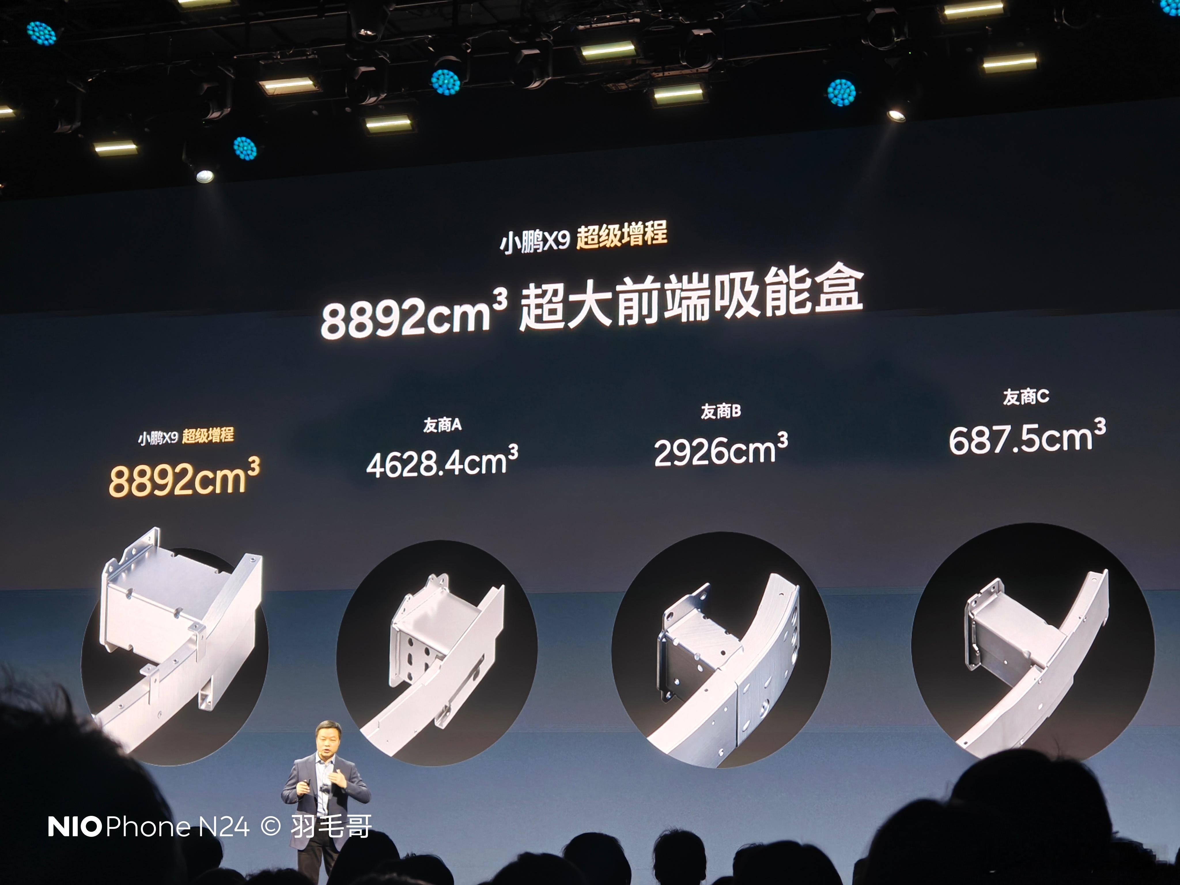前阵子第一次看到小鹏说吸能盒容积是8892立方厘米时感觉小鹏是不是学坏了也喜欢用庞大数字来吸引眼球了,结果今天他呈现友商的容积也这样。挺好,鹏还是那个鹏