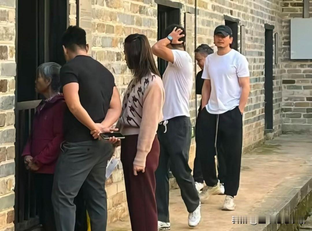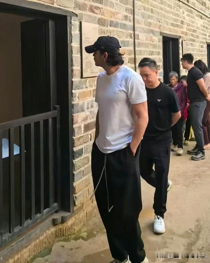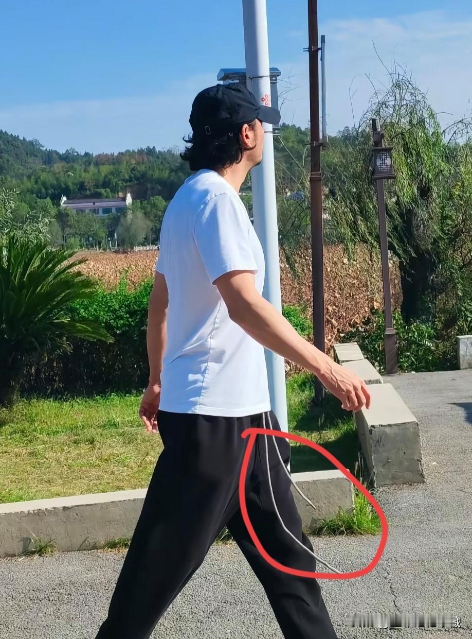 型男杨烁在湖南乡村游玩,头发卷曲,胡子拉碴,身穿白色圆领T恤衫黑色运动裤,裤腰上的系绳在裤子前飘扬,杨烁也不在乎,大步流星的走着,身形矫健,胸部肌肉结实,小胡子特有显得荷尔蒙爆棚,比同行人员高一头,这型男气质真的太帅了。
