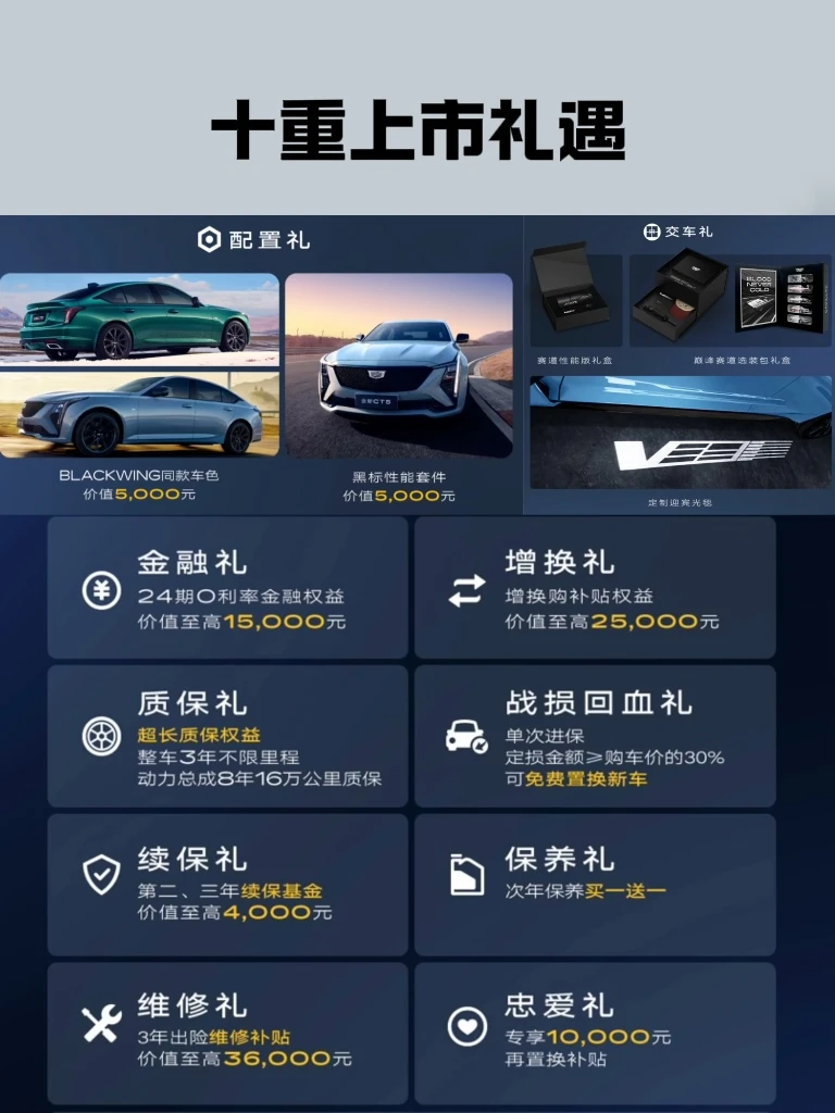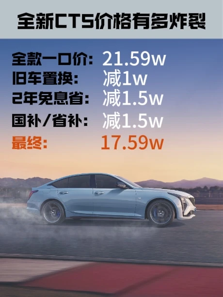 CT5这次直接开启了全车一口价模式[赞R],拒绝套路。城市运动版21.59万,赛道性能版24.59万,赛道性能版+巅峰赛道选装包26.59万。在此基础上,再送十重上市礼遇。咱们来算一笔账,看看这价格有多划算[抠鼻R]。全款一口价21.59万,旧车置换+国补/地补最高可减2.5w,这还不够,CT5还赠送了24期免息,价值高达1.5w,相当于到手一口价17.59万,价格真的一步到位[买爆R]