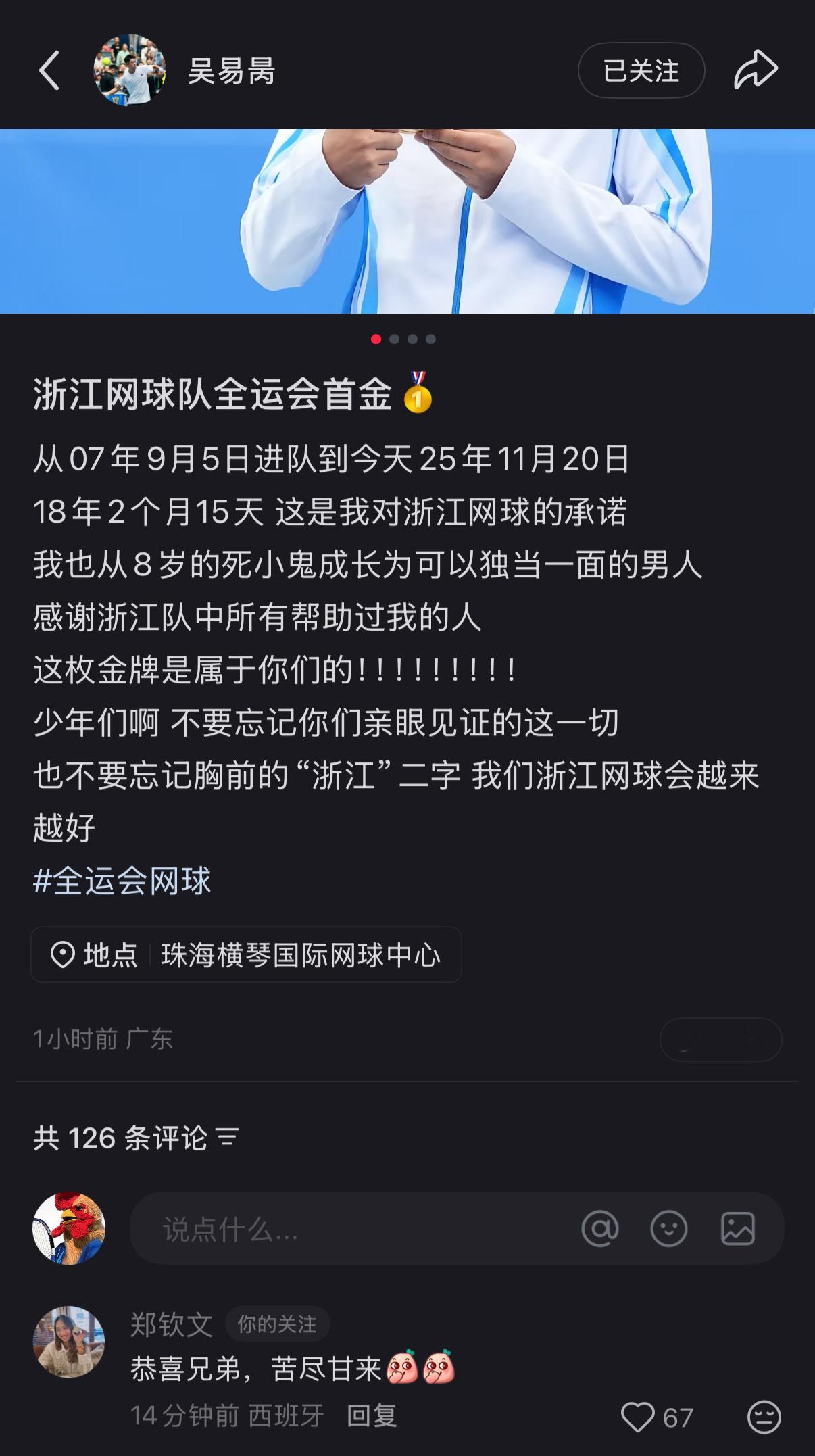 郑钦文评论区留言祝贺 :“恭喜兄弟,苦尽甘来”