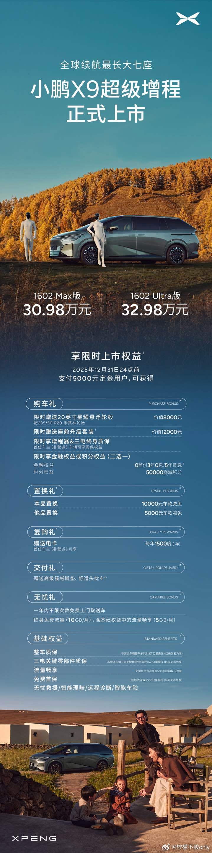 离谱!这一刻的真实写照!x9增程max版本30.98万,Ultra版本32.98万!还有免息方案!群里炸锅了。 2025年12月31日24点前下定,可享受至高价值60000元配置及积分权益:增程器和三电系统终身质保权益价值10000元;座舱升级套装+20寸星耀悬浮轮毂选装权益价值20000元限时免费;0首付3年0利息5年低利息金融权益或50000商城积分权益至高价值30000元。老用户复购还可享受至高价值23500元的复购权益:每年1500度免费充电6年有效期的复购权益价值13500元;本品置换车款减免10000元和他品置换车款减免5000元。99元抵扣5000元购车款,11月20日22:00截止
