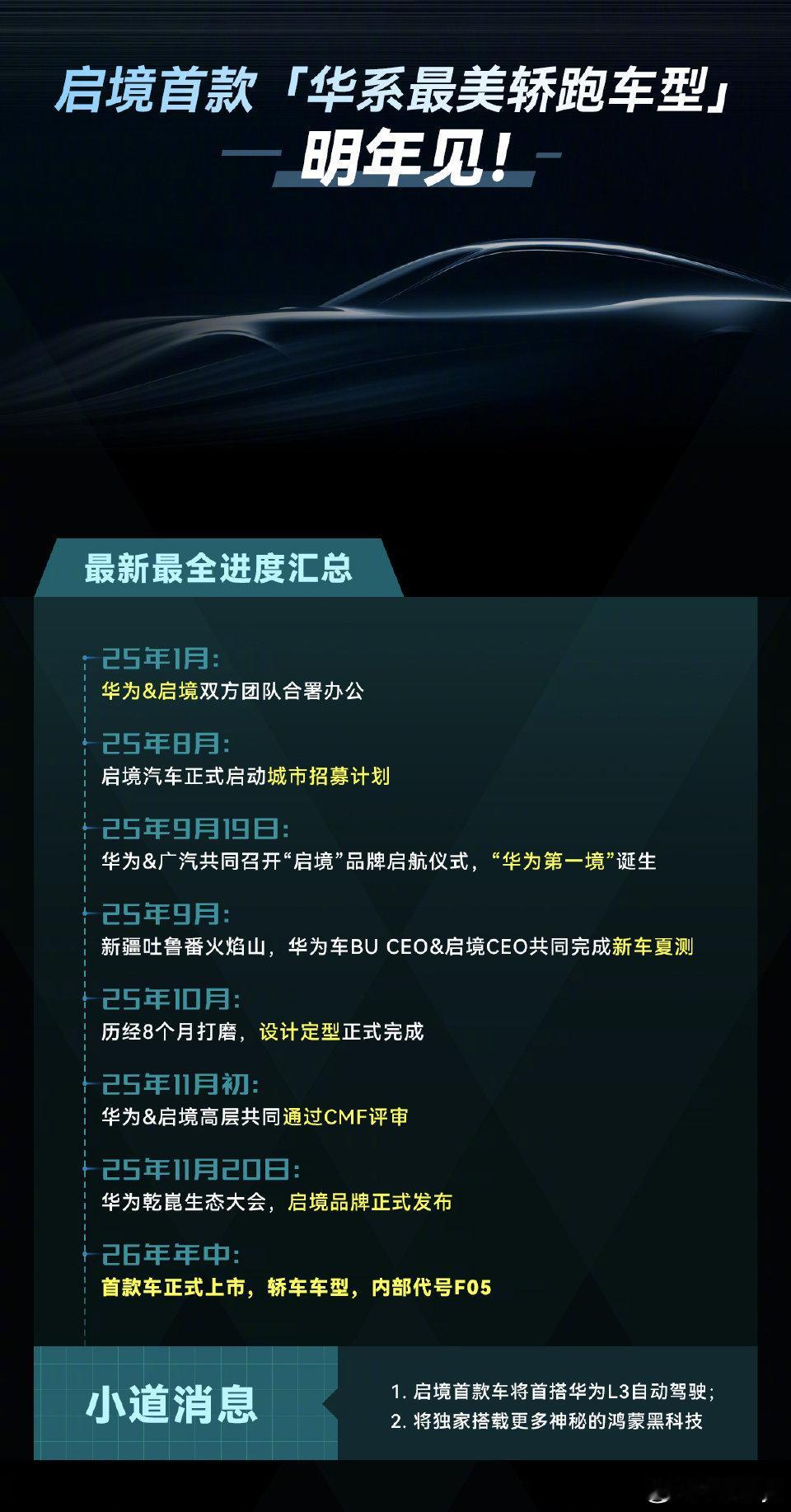 华系首款猎装轿跑要来了?启境联手华为乾崑,据说会直接上L3级别的辅助驾驶,明年6月就能见面。智能科技+造车功底双buff,期待值拉满了