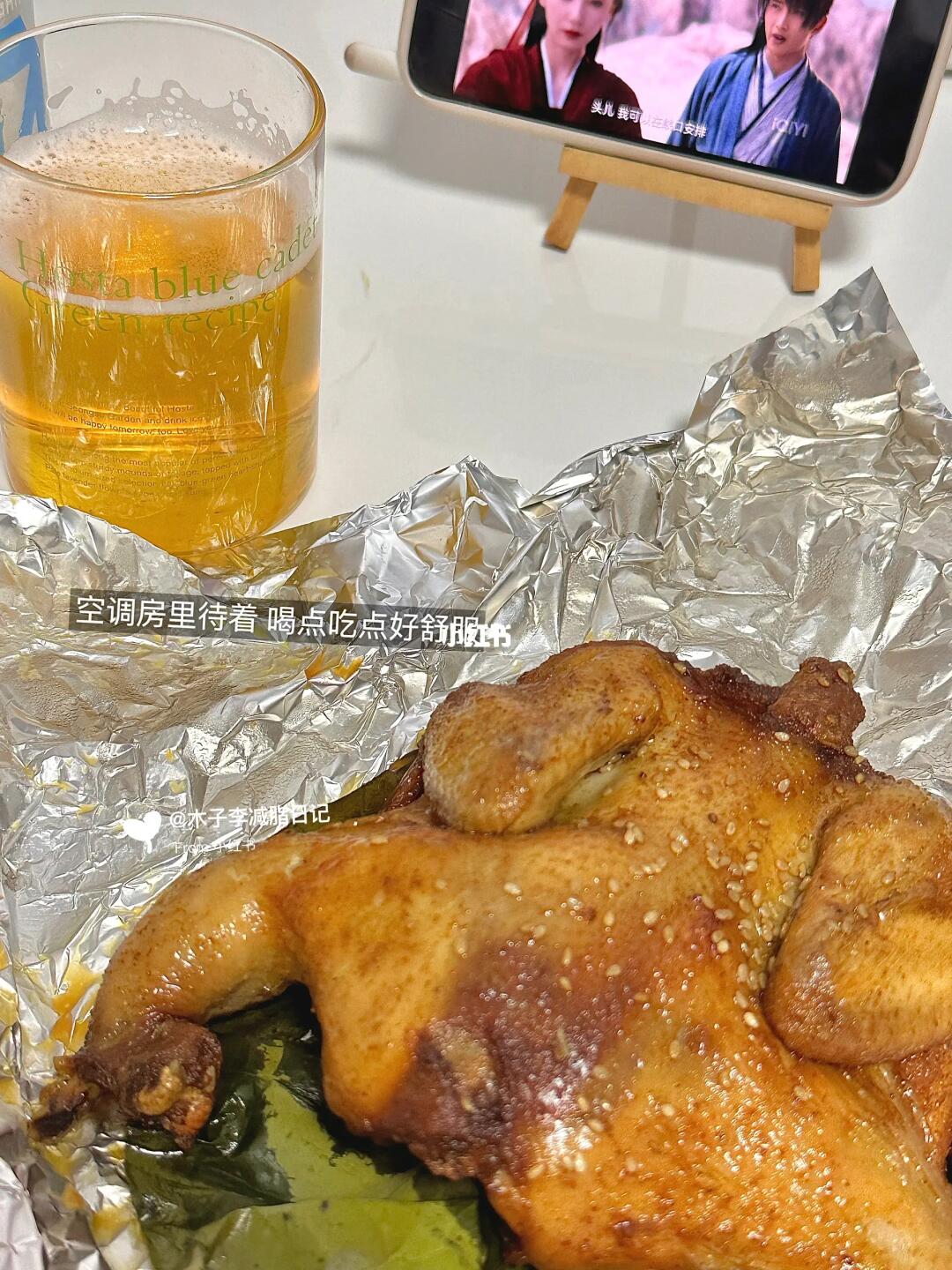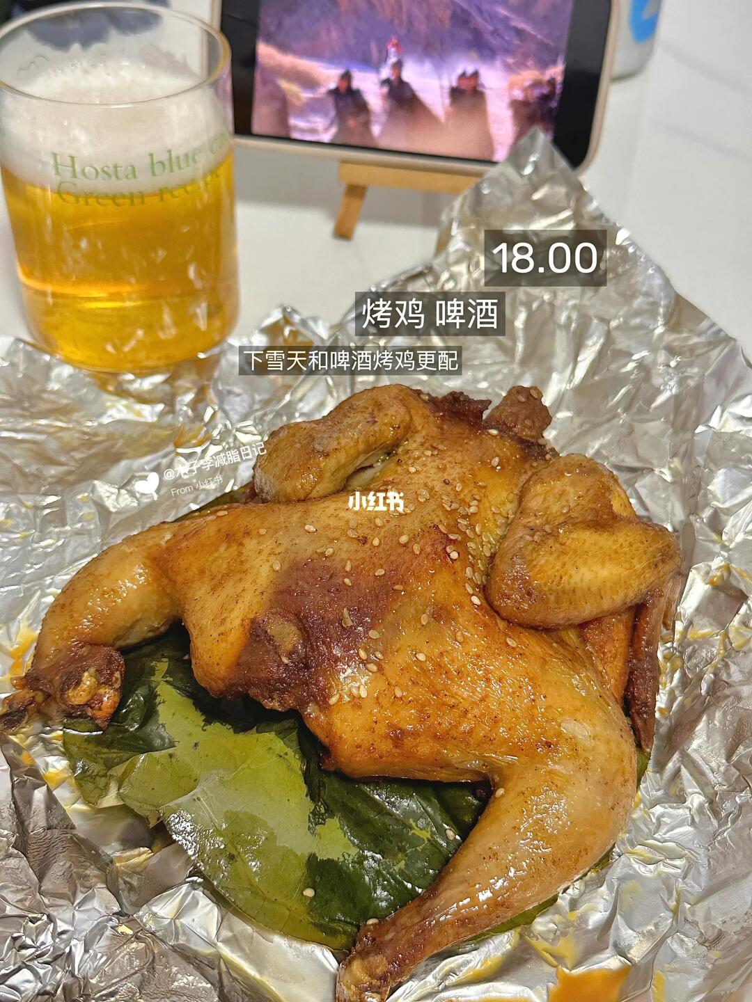 初始体重120斤 今日体重92 目标80斤 - 早:黑芝麻碱水➕鸡蛋➕黑咖啡➕鸡肉肠 午:豆腐汤 晚:烤鸡➕啤酒🍺 加:奶茶 运动🈚 - 下雪天怎么能少的了啤酒炸鸡~哈哈哈炸鸡不吃 我吃烤鸡~香嫩入味好吃😋!再来杯我的零糖皮尔森,低卡清爽,大口吃肉大口喝酒爽歪歪~ 早上吃的黑芝麻碱水里面加了肉桂,这样搭配我吃不来我还是喜欢纯芝麻的香~