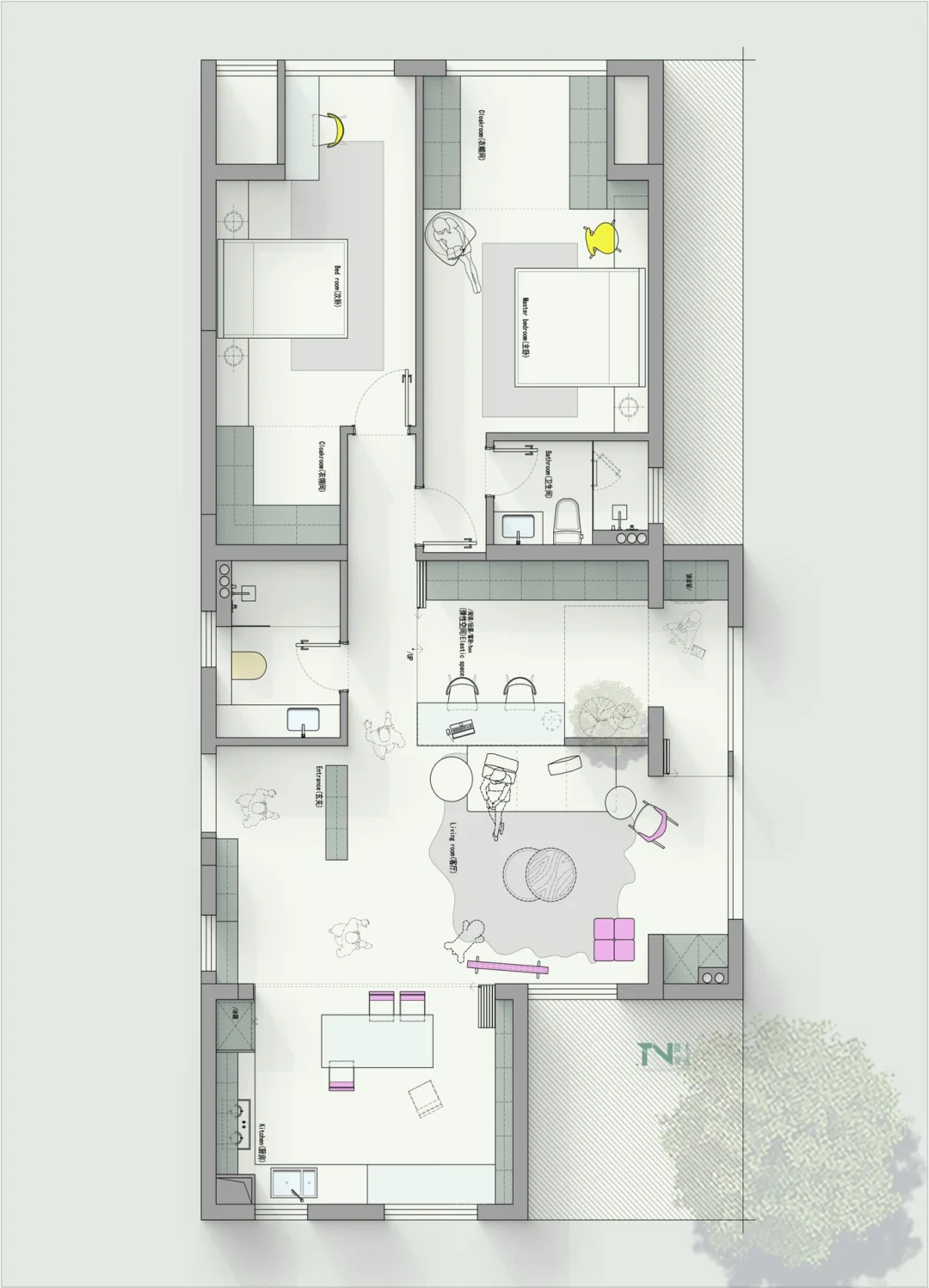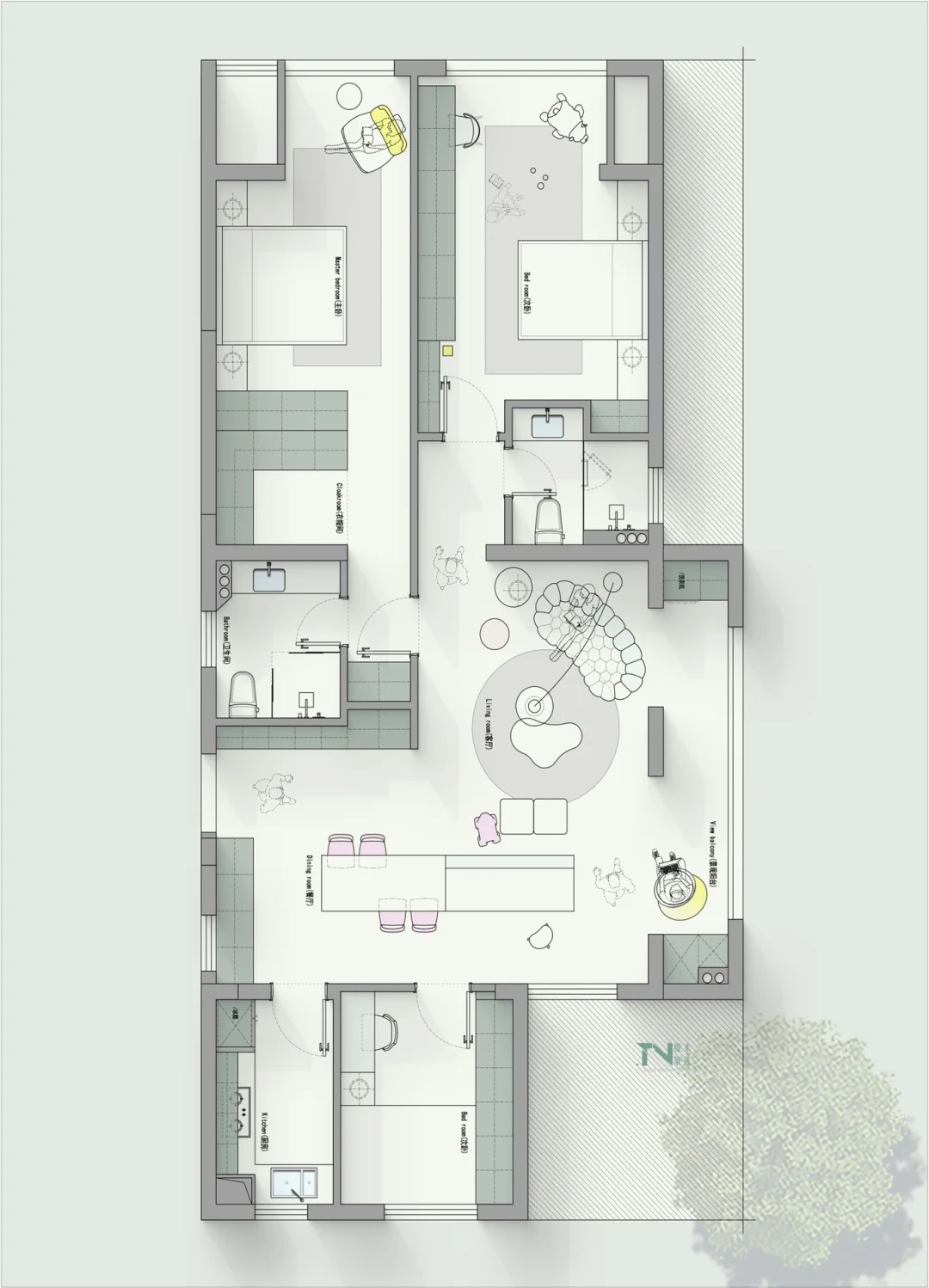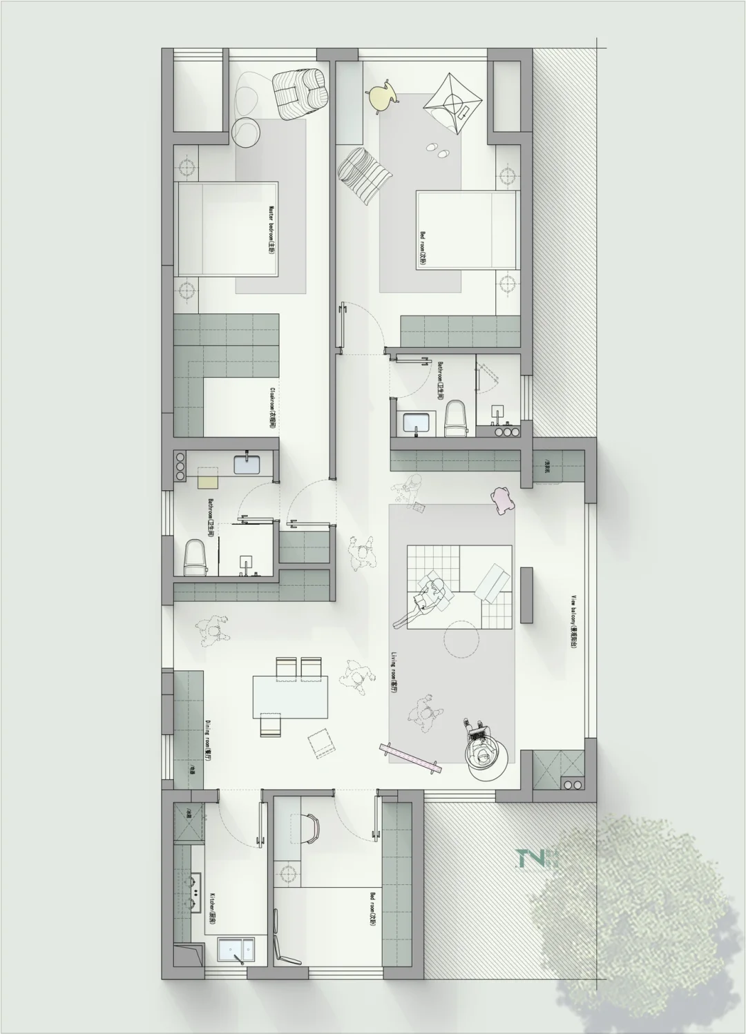 108平—长方形户型怎么去梳理动线! 设计需求: 一家三口 1、主卧+衣帽间+主卫 2、孩子房要有书桌 3、书房兼客房 4、把阳台封了,想要大的客厅 想跟邻居家不一样的布局