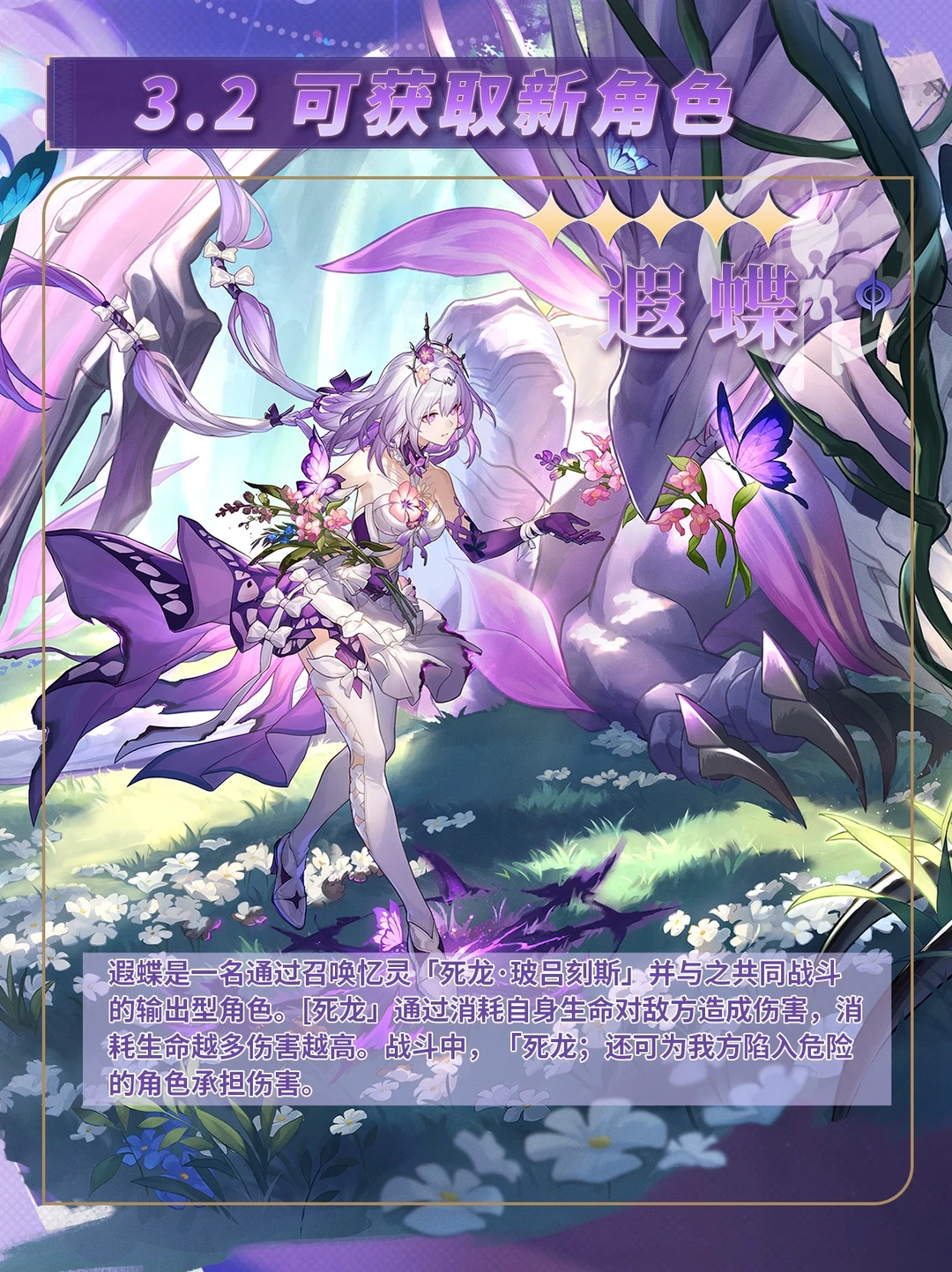 遐蝶是一名通过召唤忆灵「死龙•玻吕刻斯」并与之共同战斗的输出型角色。既龙」通过消耗自身生命对敌方造成伤害,消耗生命越多伤害越高。战斗中,「死龙;还可为我方陷入危险的角色承担伤害。