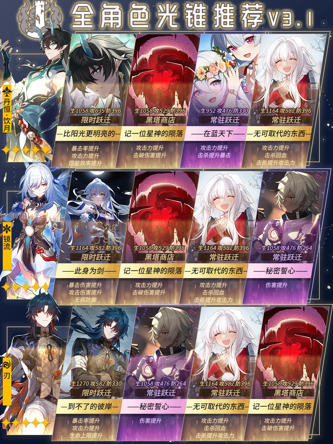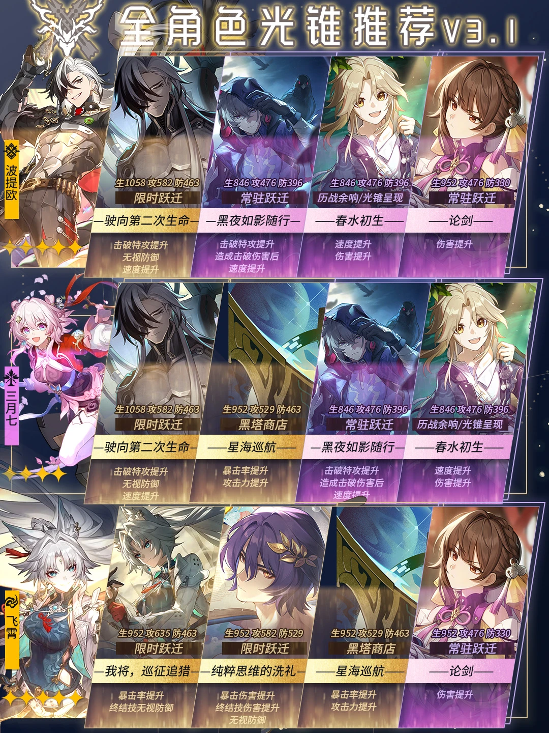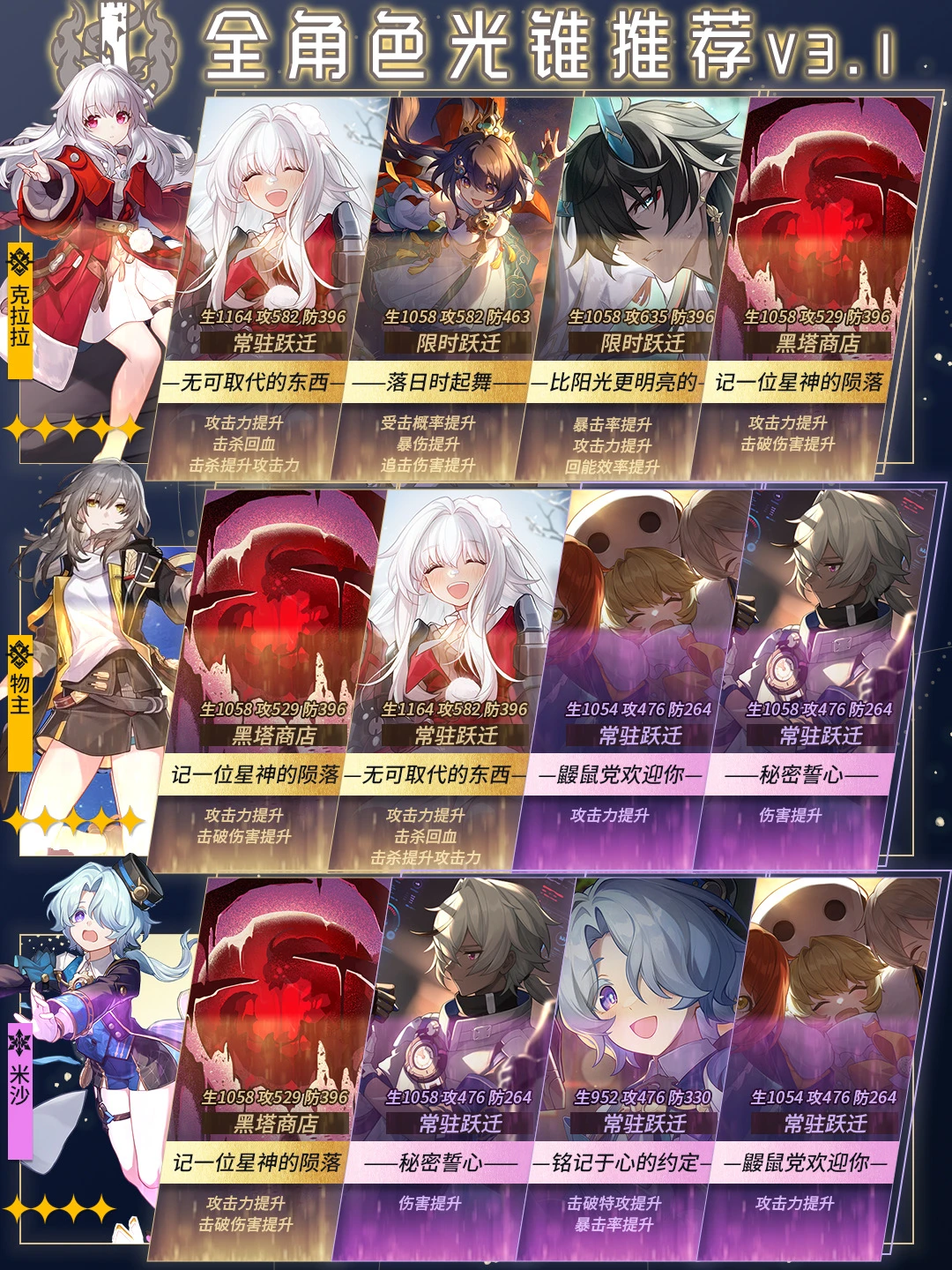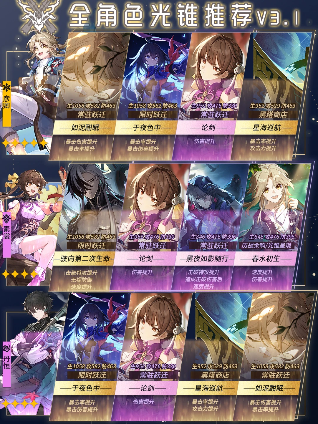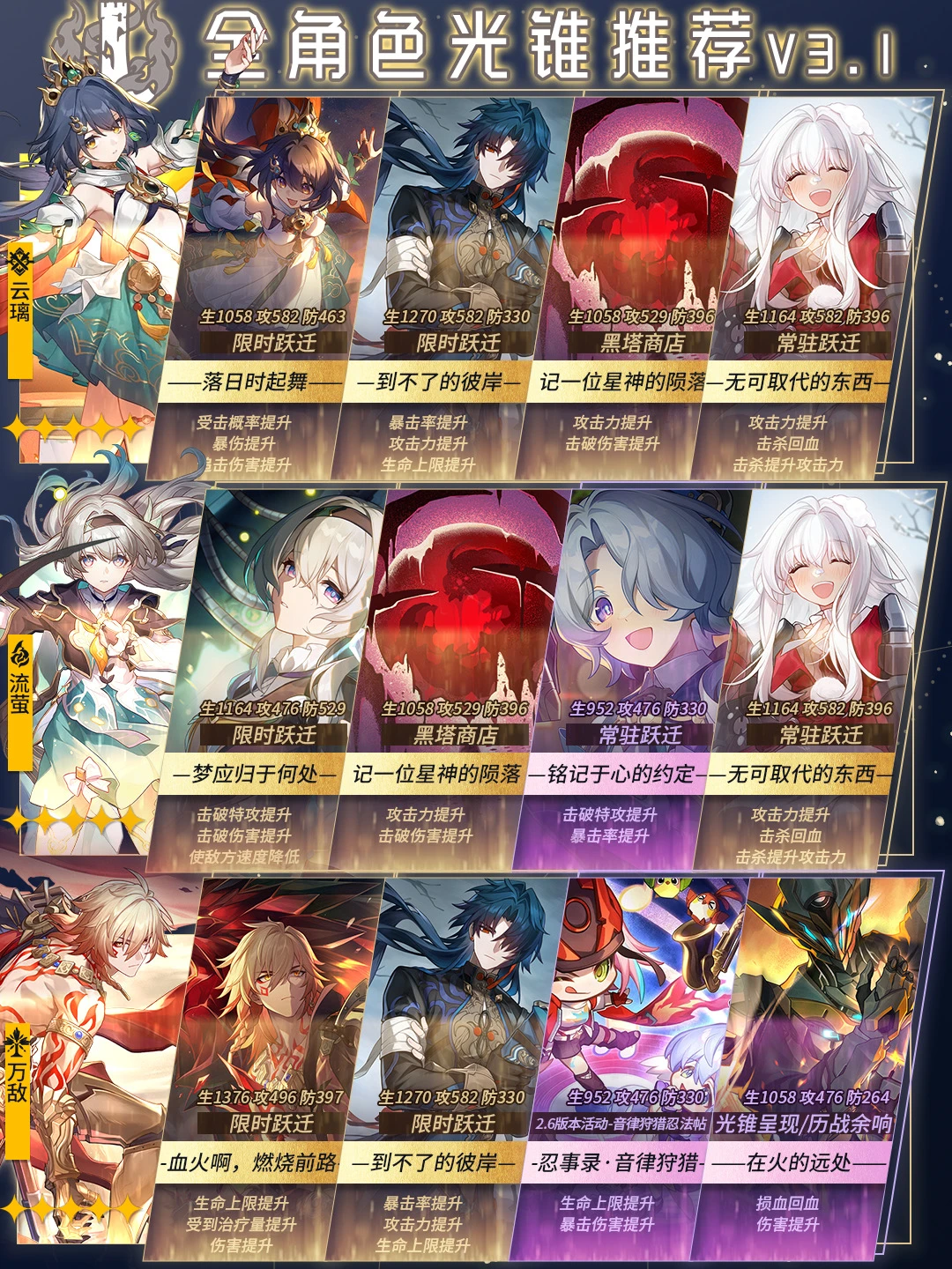 大家好 今天给大家整理了截至目前版本全角色光锥指南 分别有角色试用的五星光锥和四星光锥,以及光锥对角色的提升数据以及获取途径 感谢大家的支持,如若对体内不懂的地方可以评论留言告诉我,喜欢的点赞支持一下,我会努力把最好的攻略分享给大家使用!