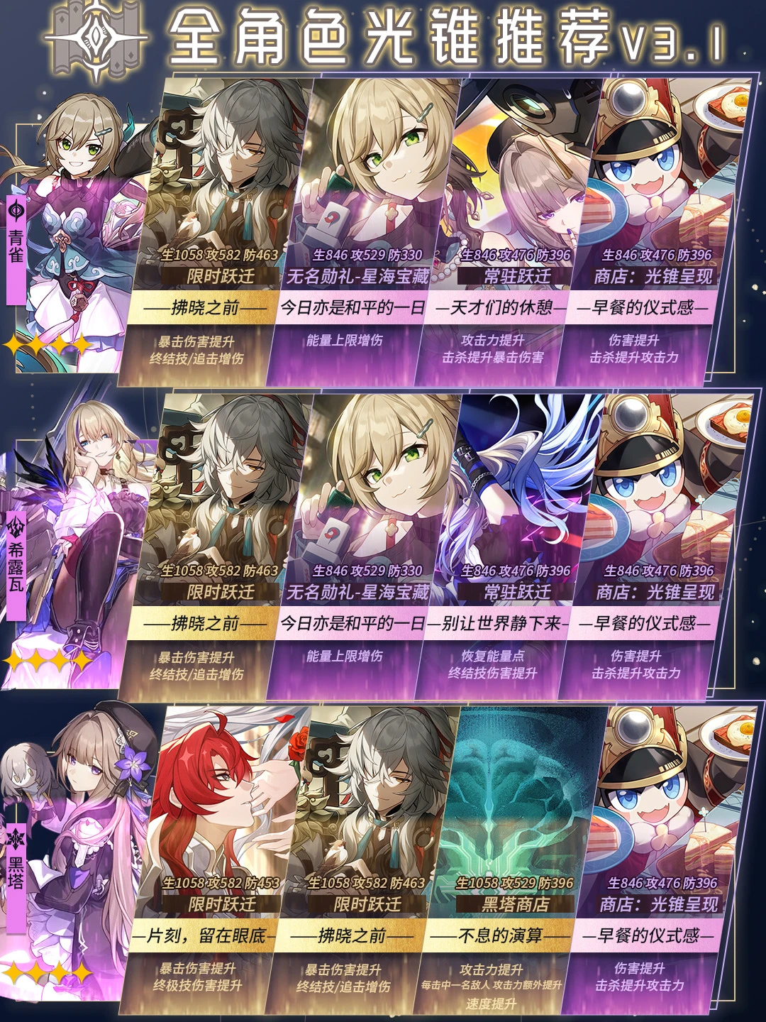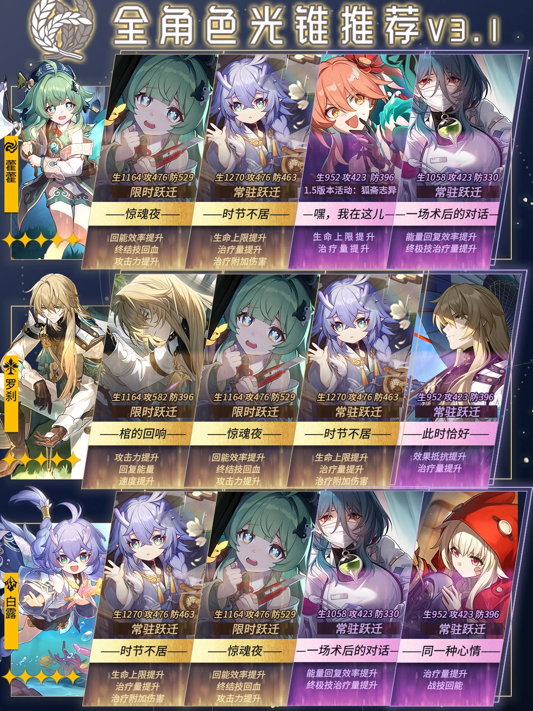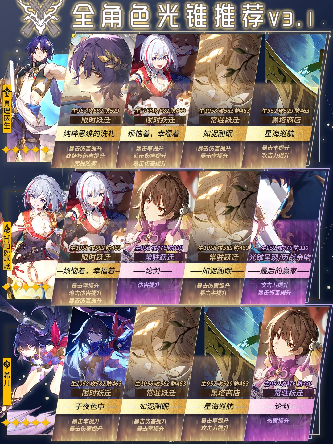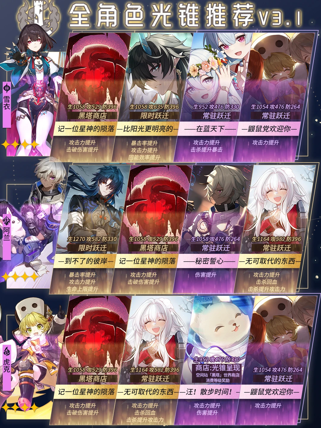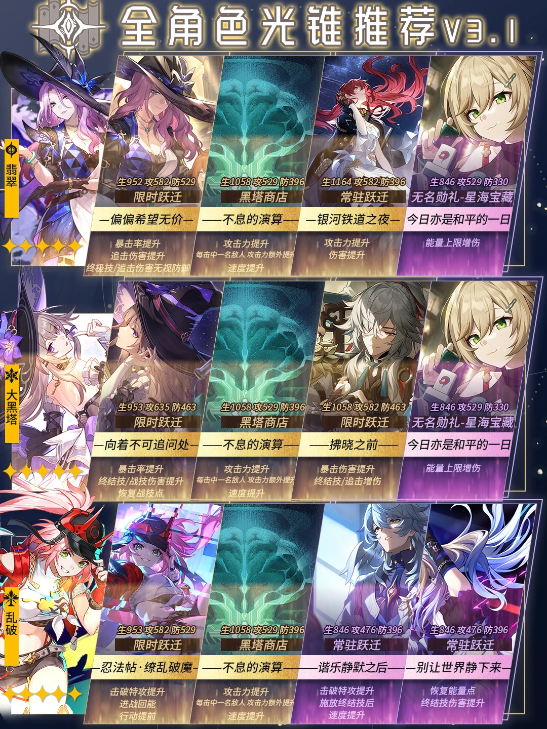 大家好 今天给大家整理了截至目前版本全角色光锥指南 分别有角色试用的五星光锥和四星光锥,以及光锥对角色的提升数据以及获取途径 感谢大家的支持,如若对体内不懂的地方可以评论留言告诉我,喜欢的点赞支持一下,我会努力把最好的攻略分享给大家使用!