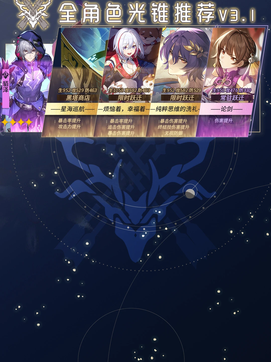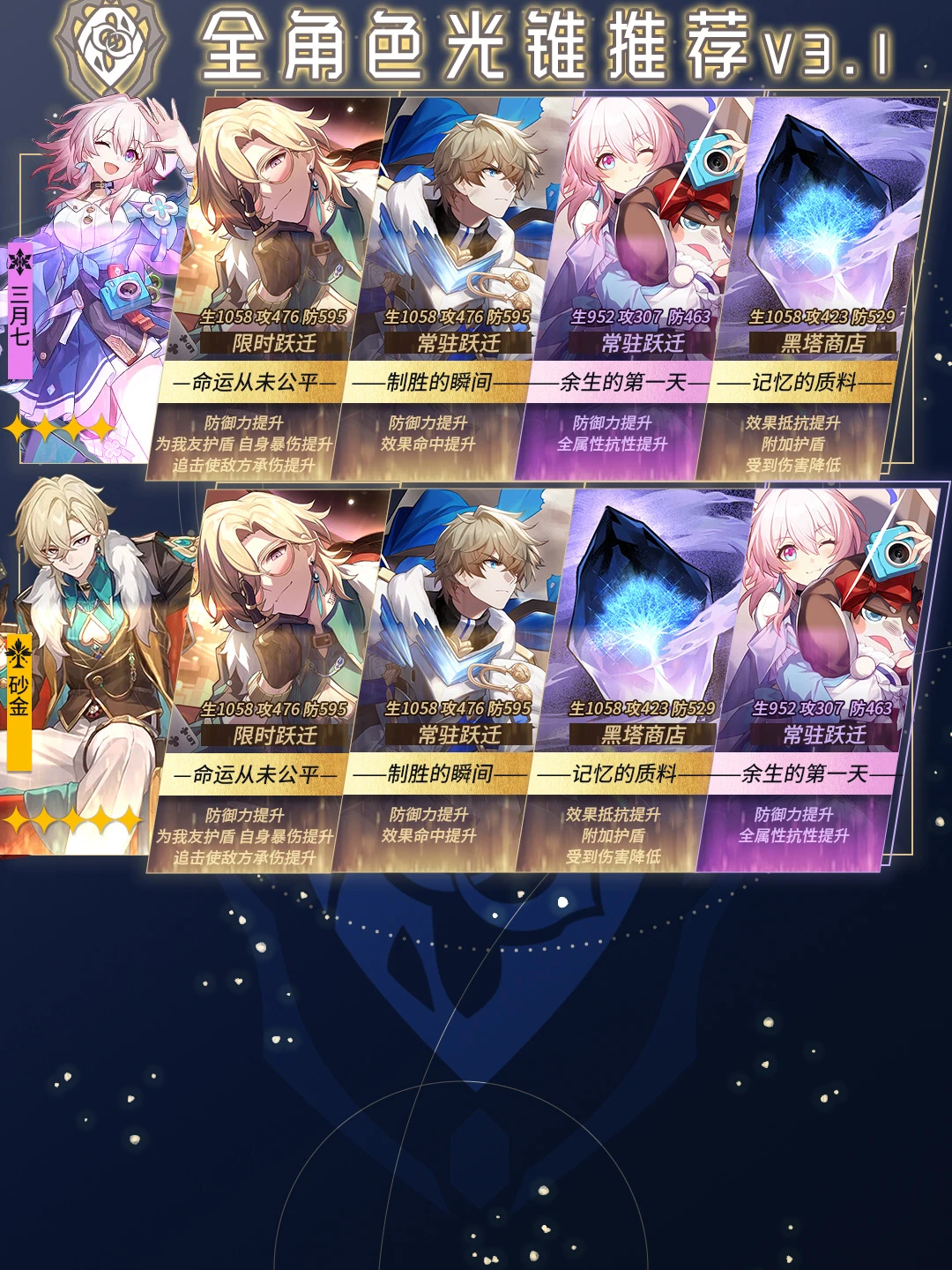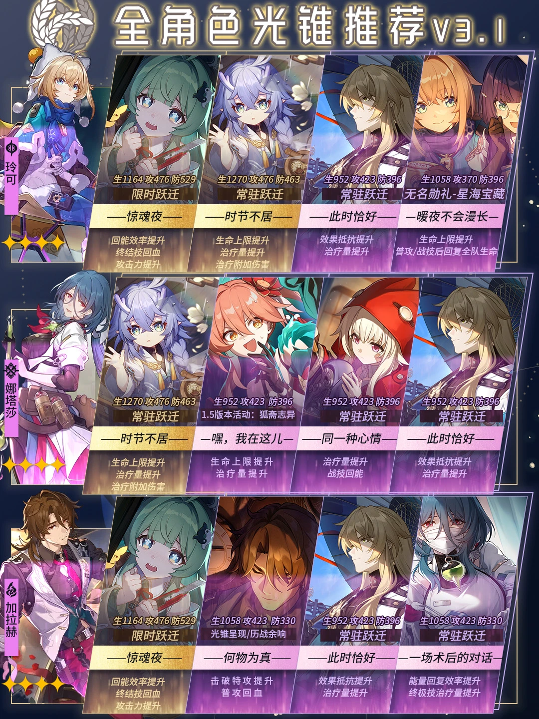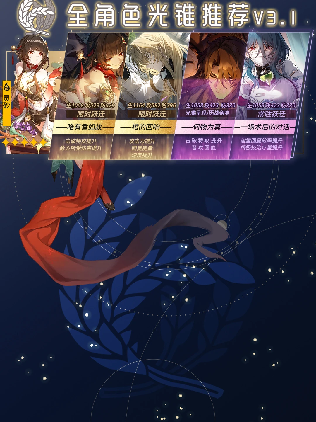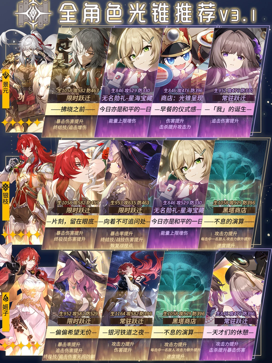 大家好 今天给大家整理了截至目前版本全角色光锥指南 分别有角色试用的五星光锥和四星光锥,以及光锥对角色的提升数据以及获取途径 感谢大家的支持,如若对体内不懂的地方可以评论留言告诉我,喜欢的点赞支持一下,我会努力把最好的攻略分享给大家使用!