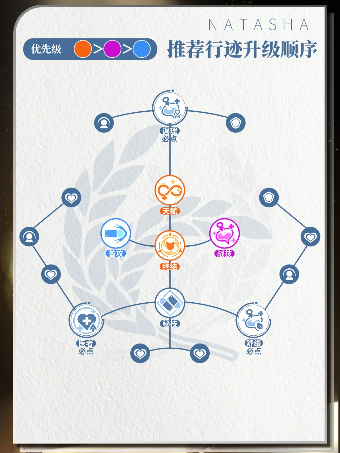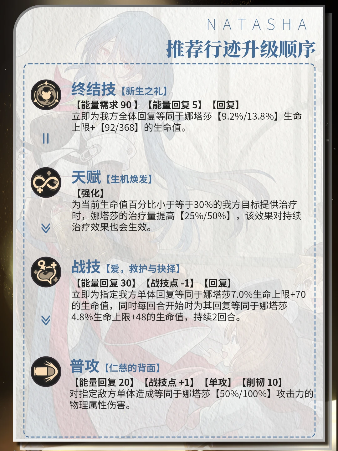 为当前生命值百分比小于等于30%的我方目标提供治疗时,娜塔莎的治疗量提【25%/50%】,该效果对持续治疗效果也会生效。