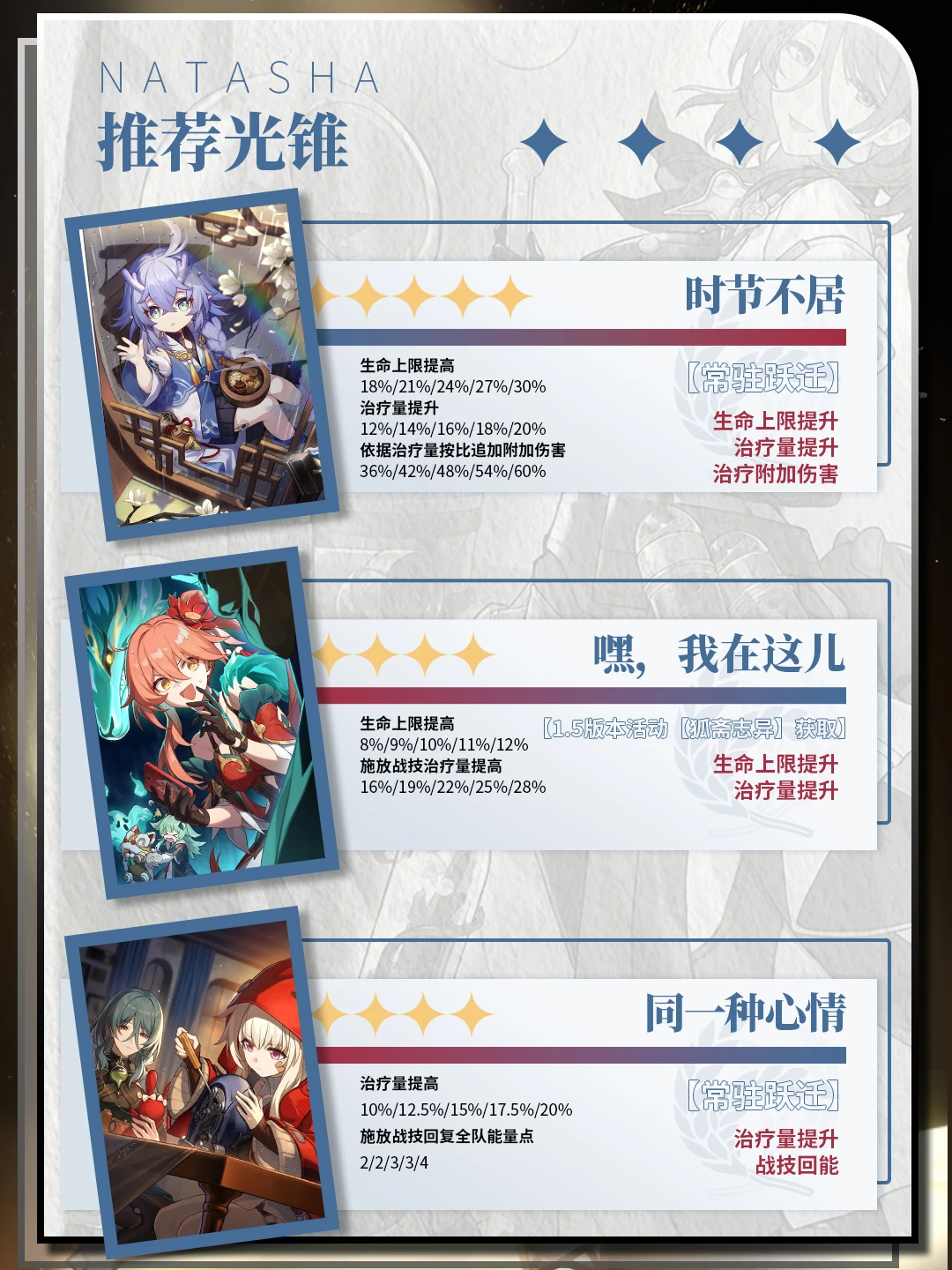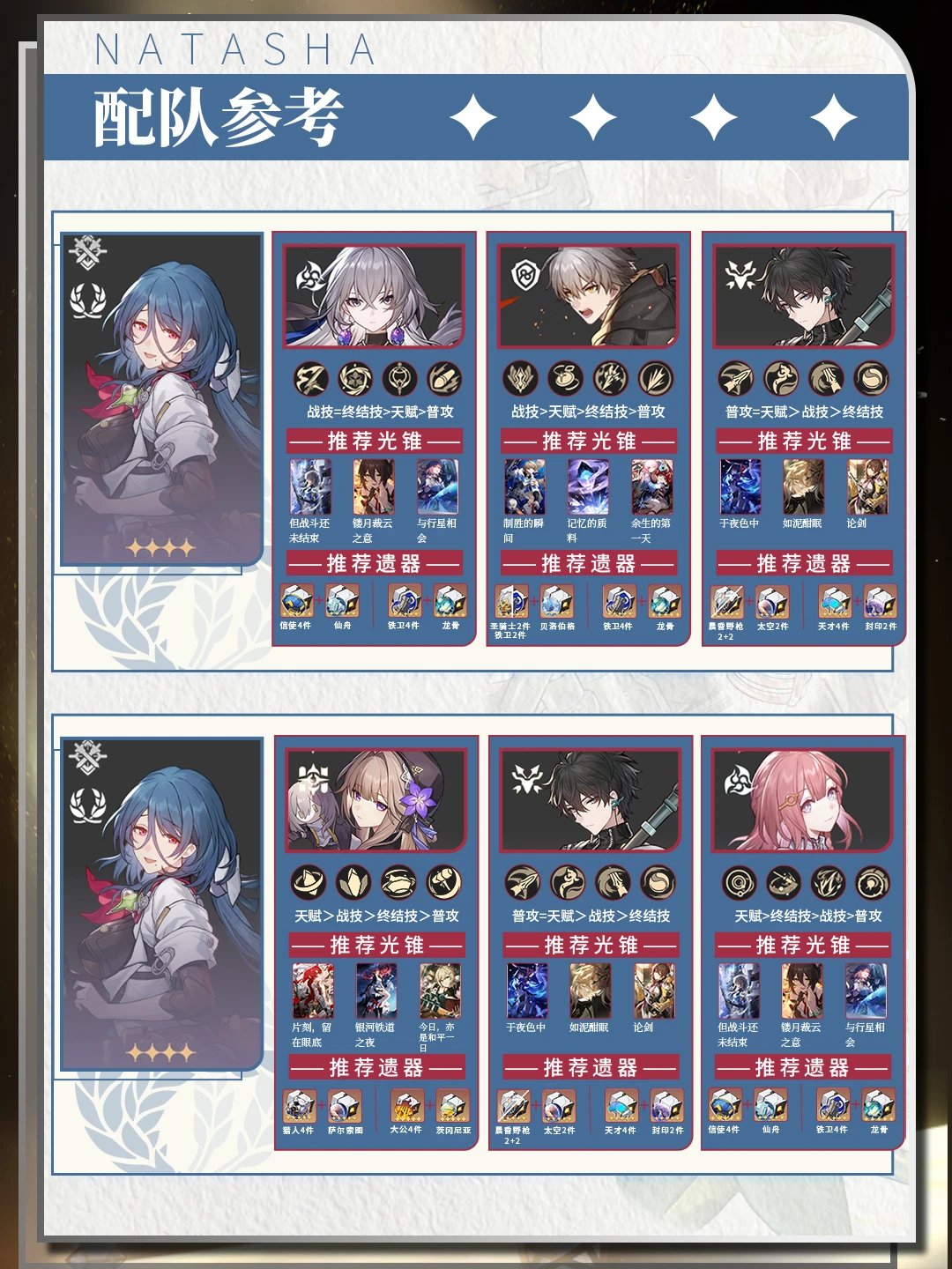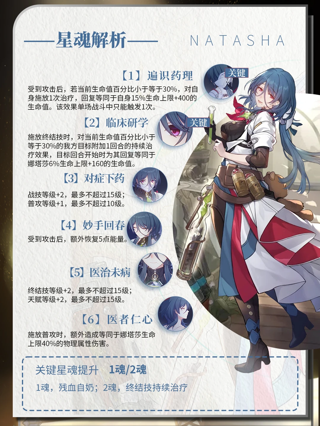 定位:娜塔莎可以通过战技为我方角色提供持续的治疗并解除一个负面效果。释放终结技,娜塔莎将回复我方全体的生命值。
