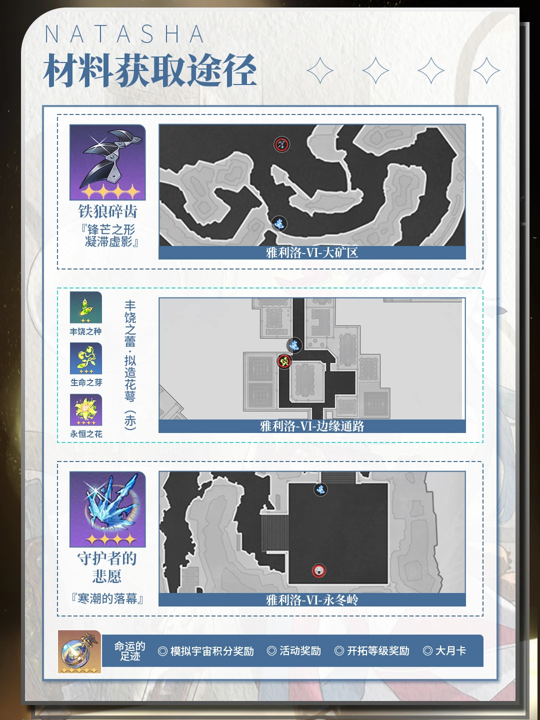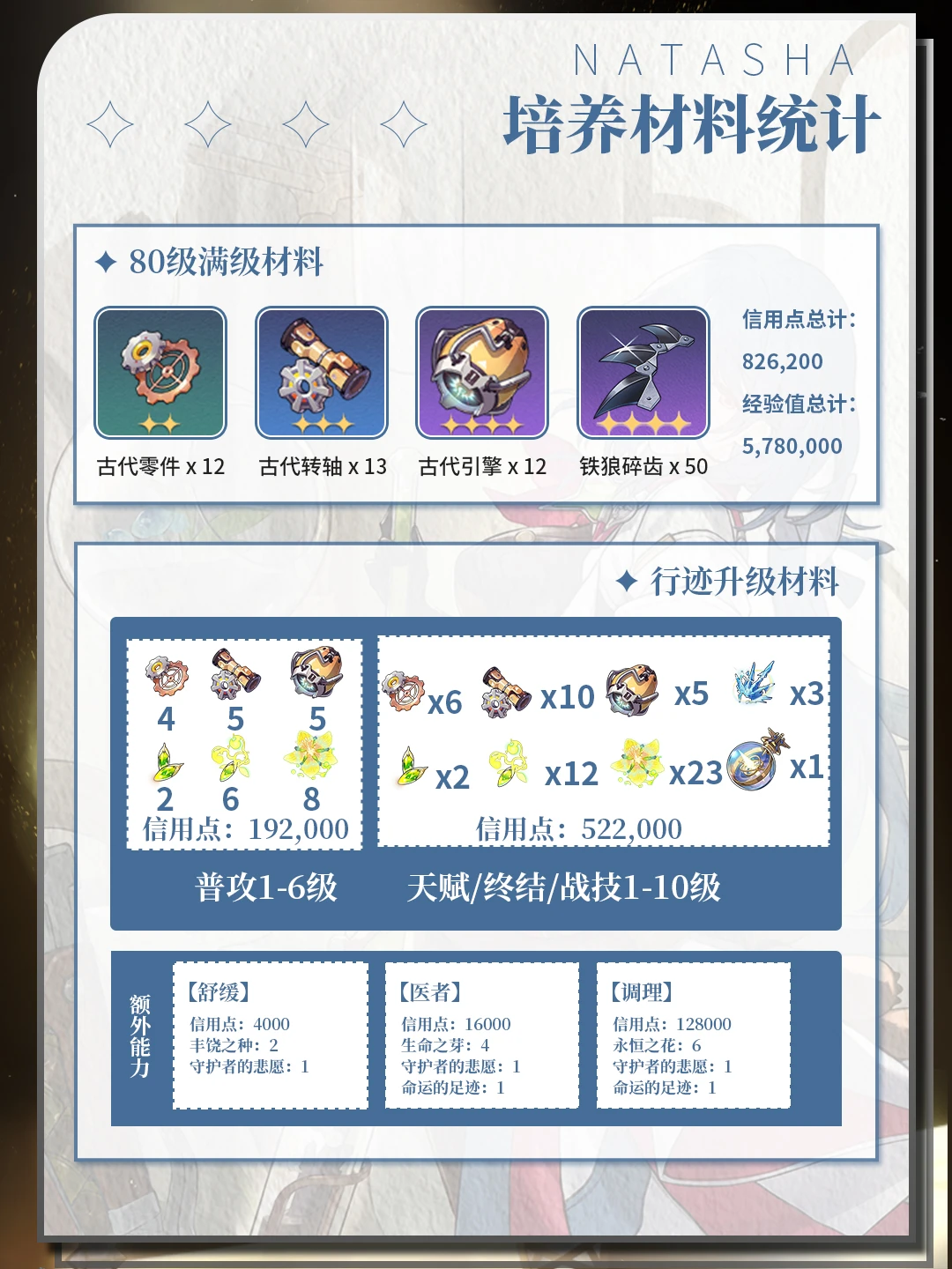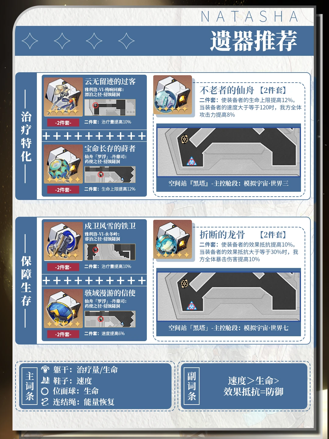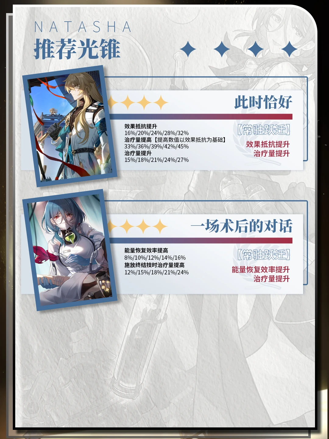 定位:娜塔莎可以通过战技为我方角色提供持续的治疗并解除一个负面效果。释放终结技,娜塔莎将回复我方全体的生命值。